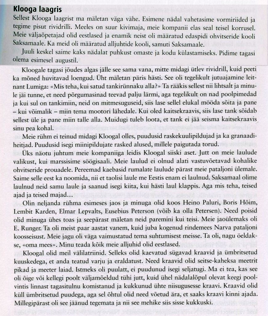 Kloogal olnud vangilaager asus meie kasarmutest eemal. Info, et selline laager seal üldse on, levis poiste seas. Räägiti, et sinna minna ei tohi, kuigi me ei teadnud, kus see on. Sellist keeldu ei andnud ülemused, see kuuldus lihtsalt levis. Kord sattusin ma siiski lõuna ajal hulkudes ühe traataia lähedale, mille taga oli ka üks barakk. Selle baraki juures oli üks naine.! Traataed oli korralik, aga valvureid ei paistnud. Ligi ma ei läinud, aga see barakk näis sel ajal tühi olevat.