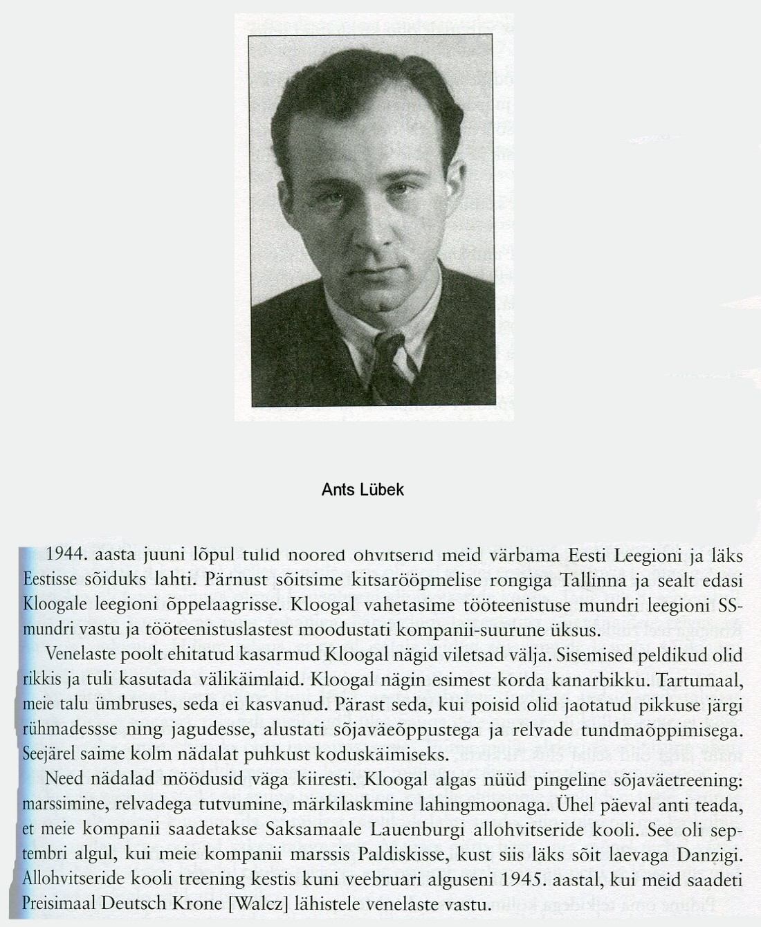 Klooga laagrisse toodi mingiks ajaks ka Soomest tulnud oh- vitseridekooli kadetid, kes moodustasid eraldi kompanii. Mõnel korral lasti neid meile jaoülematena õppusi läbi viima. On jäänud meelde nende rünnakujuhis, mis erines meie omast. Meile õpetati, et rünnakul tuleb hüpetega joosta kümme sammu, siis pikali viskuda, end kõrvale veeretada jne. Soomepoiss õpetas: ei tule püsti tõusta, vaid kätega end „üles tõugata”, nii et said viis kuni seitse sammu edasi minna, enne kui uuesti maha kukkusid. Ohvitserid (vänrikki’d) ega ka Eesti Vabariigi sõjakooli lõpetanud aspirandid ei tulnud arvesse. Umbes pooled neist olid rindekogemusteta ja määrati rügemendi staabi reservi. Saksamaal saadeti nad Bad Tölzi, kus nad pärast lõpetamist said Untersturmführer i auastme.