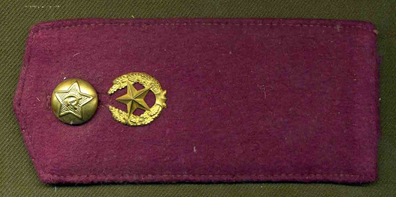 toonide võrdlus - jalaväe vaarikas (malina) ja suurtükiväe punane. Tärnid on erinevad kuna sinelit võidi kanda nii välivormina (rohelised eraldusmärgid) kui igapäevasena (kuldsed/hõedased tärnid ja embleemid).
