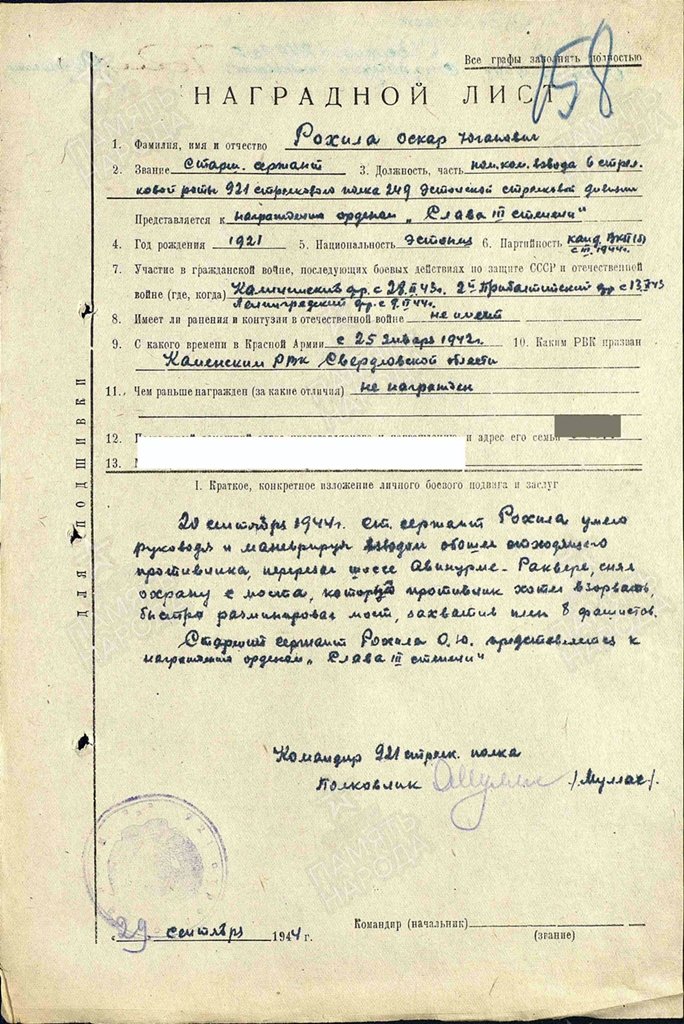 Nüüd on teada ka Punatähe ordeni nr. 843572 kavaler. Selleks on vanemseersant Rohila, 249. Laskurdiviisi 921. laskurpolgu 6. laskurroodu rühmaülema abi. Sai ordeni selle eest, et 20.09.1944 oskuslikult rühma juhtides liikusid ümber lahkuva vaenlase, ületasid Avinurme- Rakvere maantee, võttes sillalt mille vaenlane tahtis õhkida maha valve, vangistasid selle käigus 8 vastase sõdurit ja demineerisid lõhkelaengud.