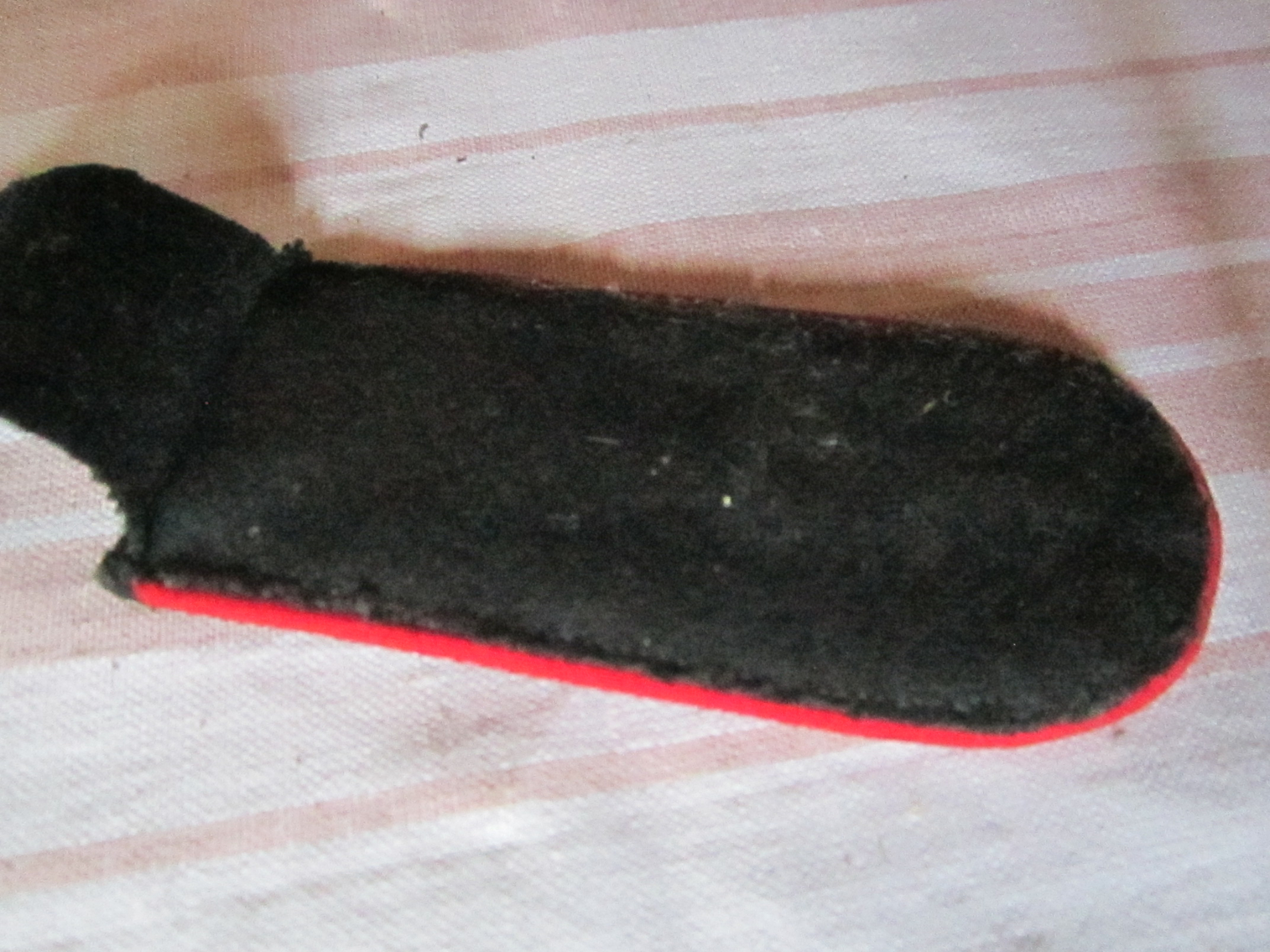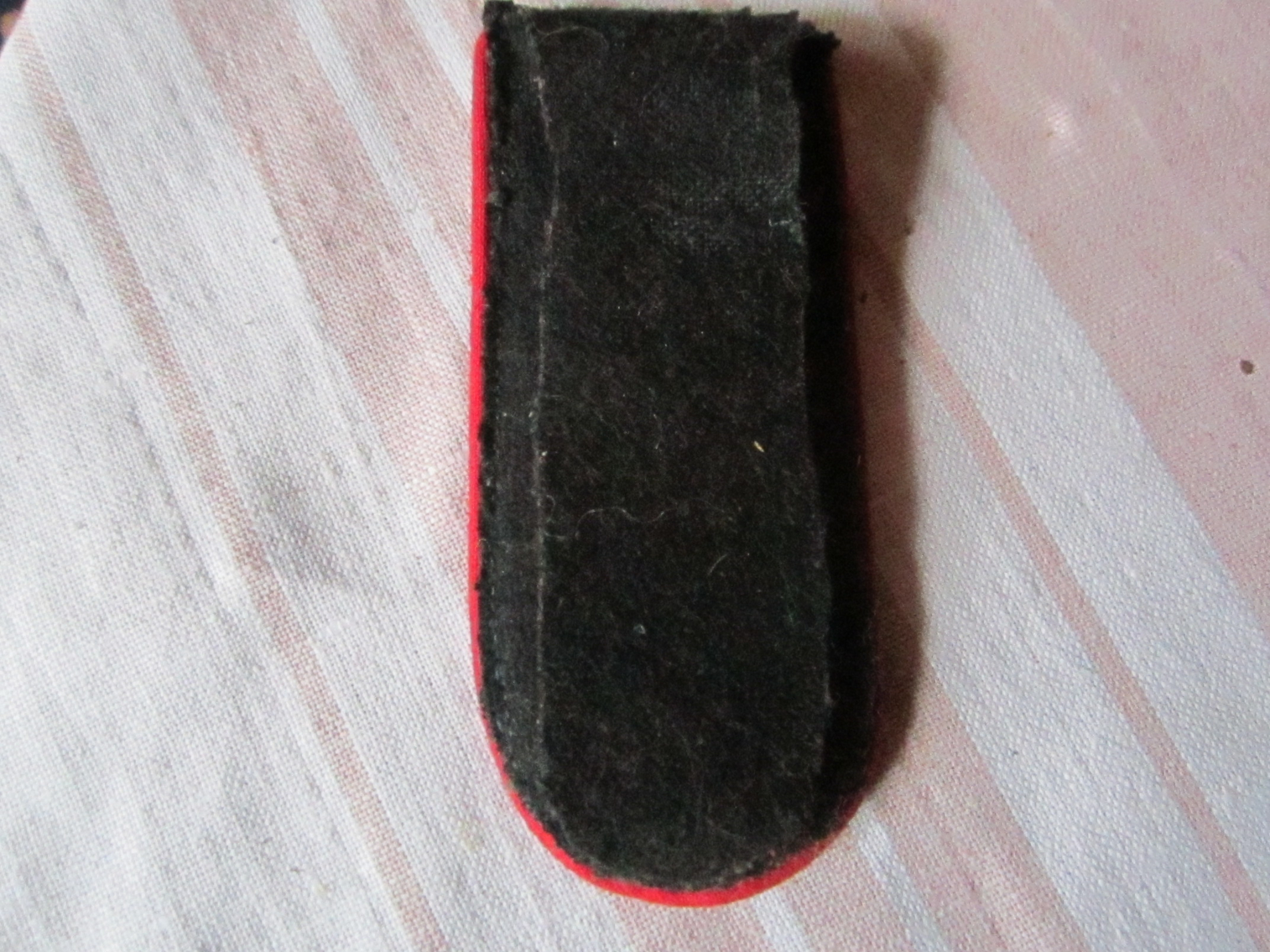 T eine pagun 13cm. pikk,laius4,5cm. Ümbritsetud punasese randiga, ümber (paguni peal)jookseb1cm.laiune kuldne põimitud lint ja paguni keskel on kuldne punutud kitsas triip mustal pinnal.