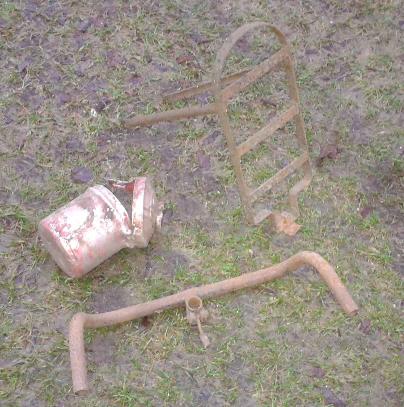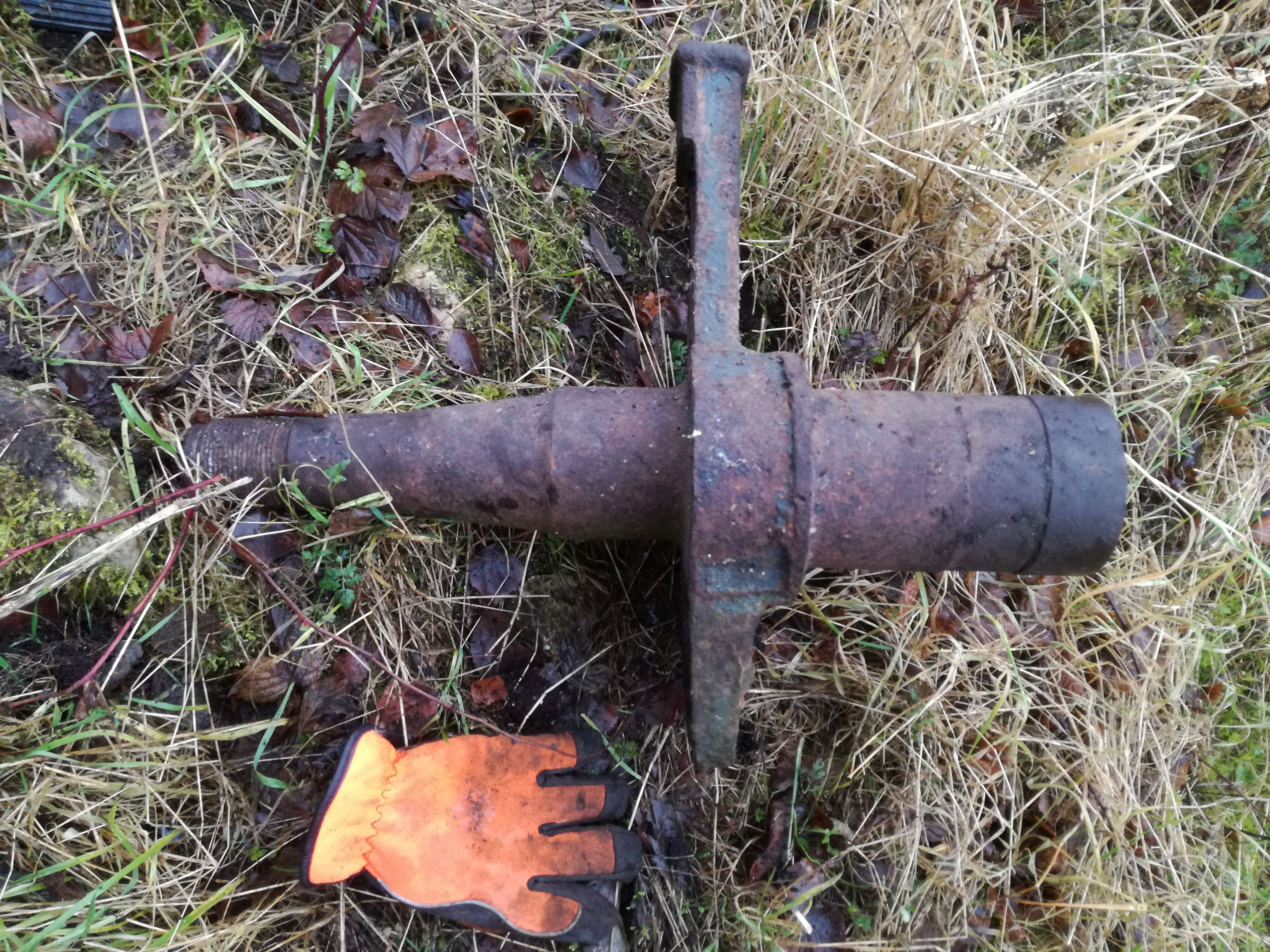 Sõjakolahunnikust tuli kahtlane kääga, omal ajal sinakashalli värviga kaetud. Kas tegemist on ehk mõne kahuri küljest eemaldatud detailiga?