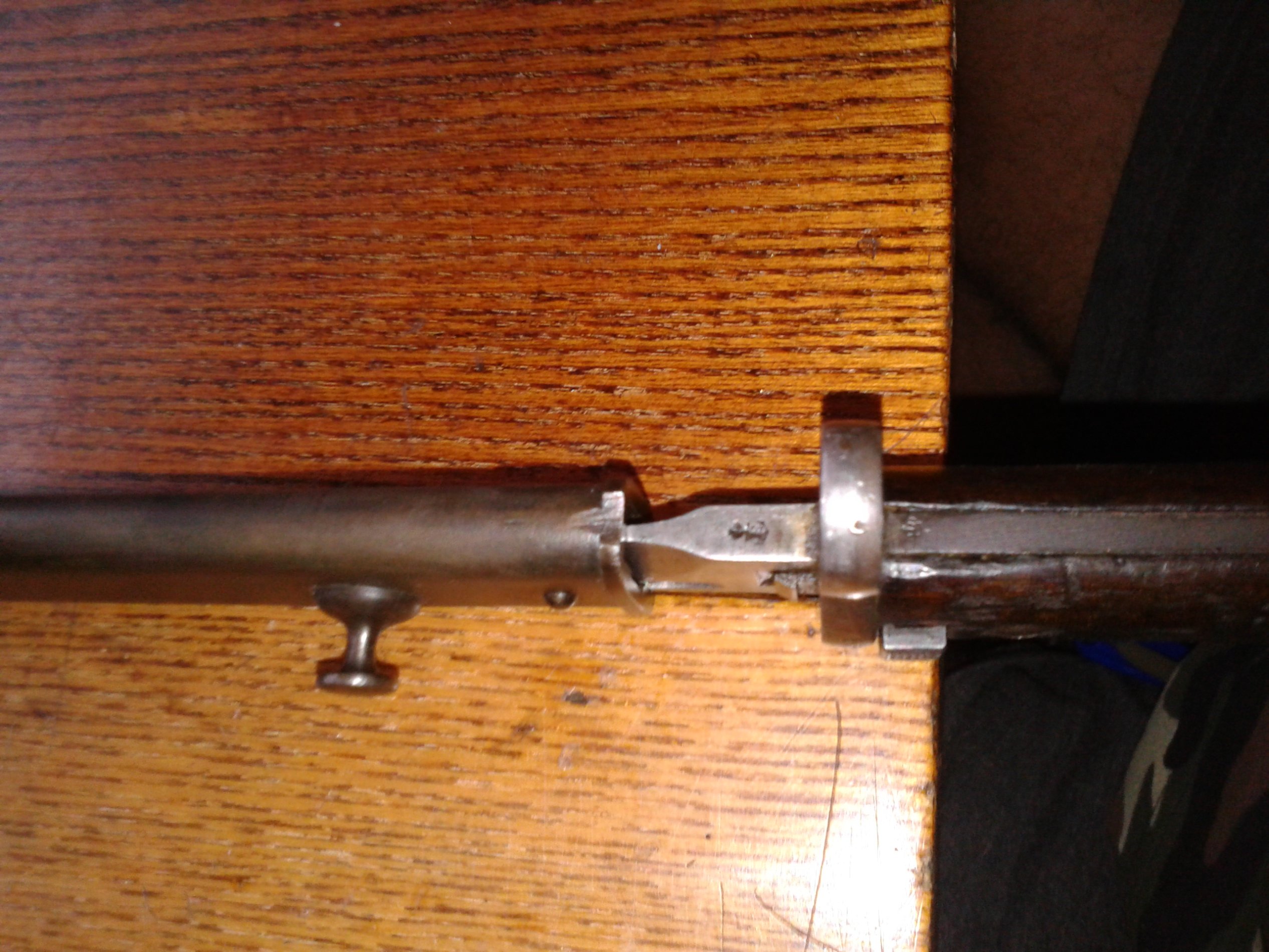 üleval -- Briti SMLE karabiini torketäägi esimene, 1939.a pärit nelikantteraga mudel. Socket´il on kirje GR krooniga keskel(-Georgius Rex), siis täägi mudeli kirje No4 MkI (sama kirje on ka tupe kõril) ja tootjamärgis S_M(-Singer Manufacturing). Komplektis on kitsale tupele sobitatud briti standardrihmakinnitus, mille tagaküljel on tempelkirjed.