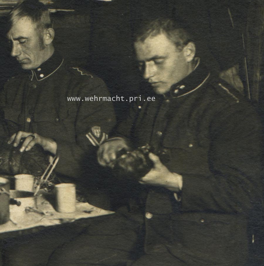 Sama sinel on paremalt teisel mehel seljas . Pagunid on pealt ära lõigatud , kuna sinel oli sellel härral ka kasutuses ka peale sõda .