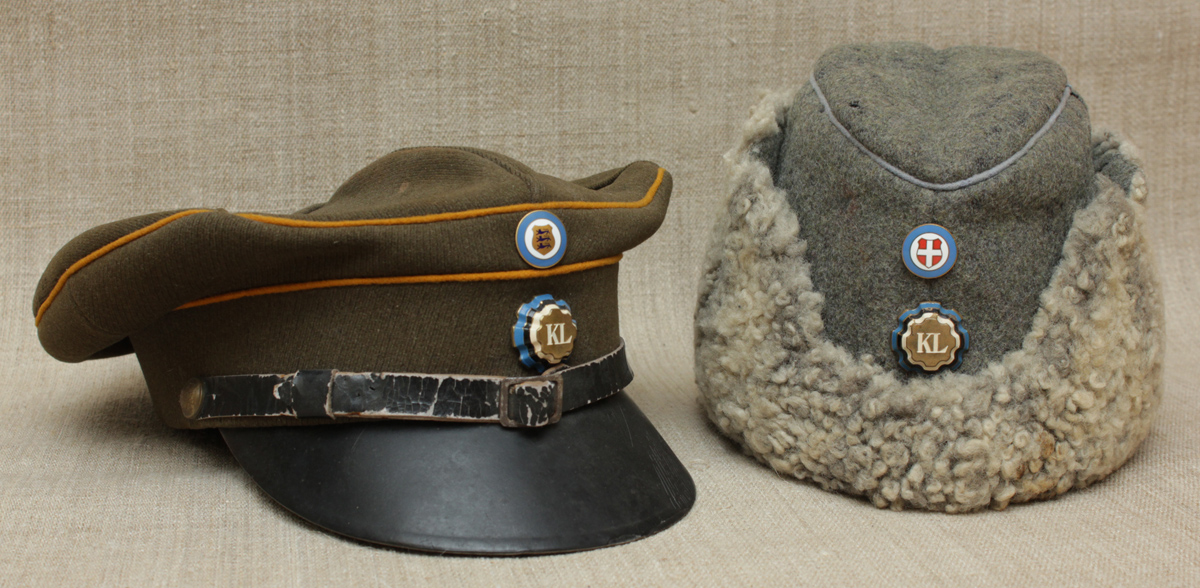 Jalaväe allüksuse mütsil Tallinna kokard, halli kandiga ratsaväe allüksuse talvemütsil Harju maleva kokard.