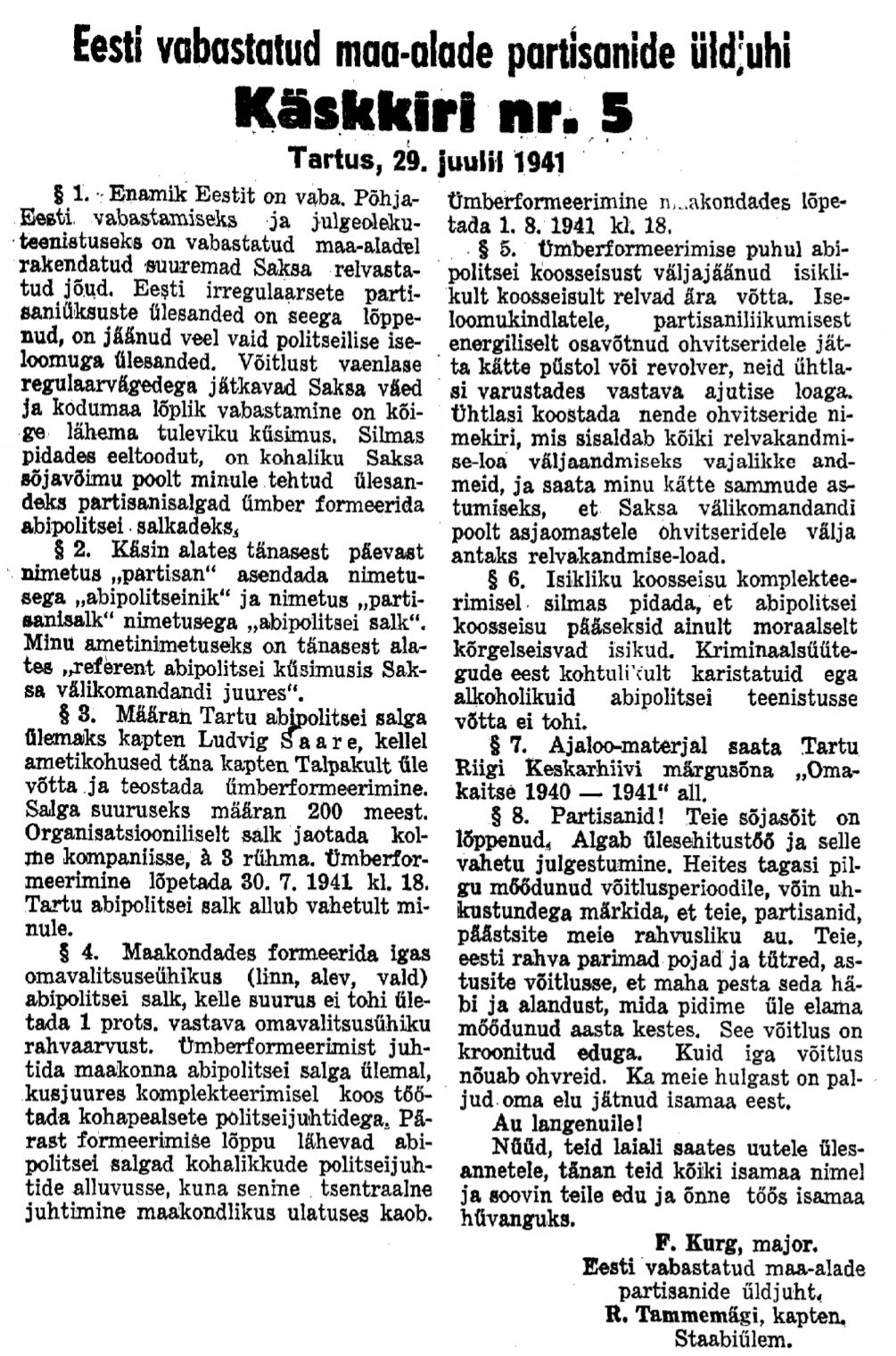 Eesti vabastatud maa-alade partisanide üldjuhi päevakäsu nr. 5 § 2 ütleb: "Käsin alates tänasest päevast [29.07.1941] nimetus "partisan" asendada "abipolitseinik" ja nimetus "partisanisalk" nimetusega "abipolitsei salk".".