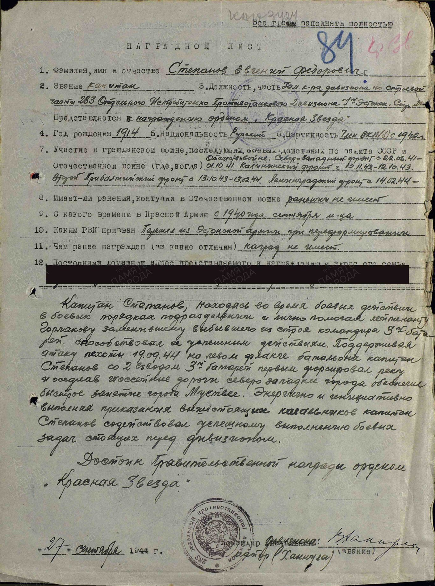 Kapten Jevgeni Stepanov, 7. Eesti laskurdiviisi 283. Üksiku tankitõrje suurtükiväedivisjoni komandöri asetäitja. Isamaasõja II klassi ordeni nr. 428632 kavaler. Stepanov on 1944.a saanud ka Punatähe ordeni, mis kannab numbrit 939421 ja anti talle Emajõe forsseerimise ning Mustvee linna lahingute eest. 1956. aastal autasustati teda veelkord Punatähe ordeniga mis kannab numbrit 3536520, aga seda ilmselt juba Nõukogude armees väljateenitud aastate eest.