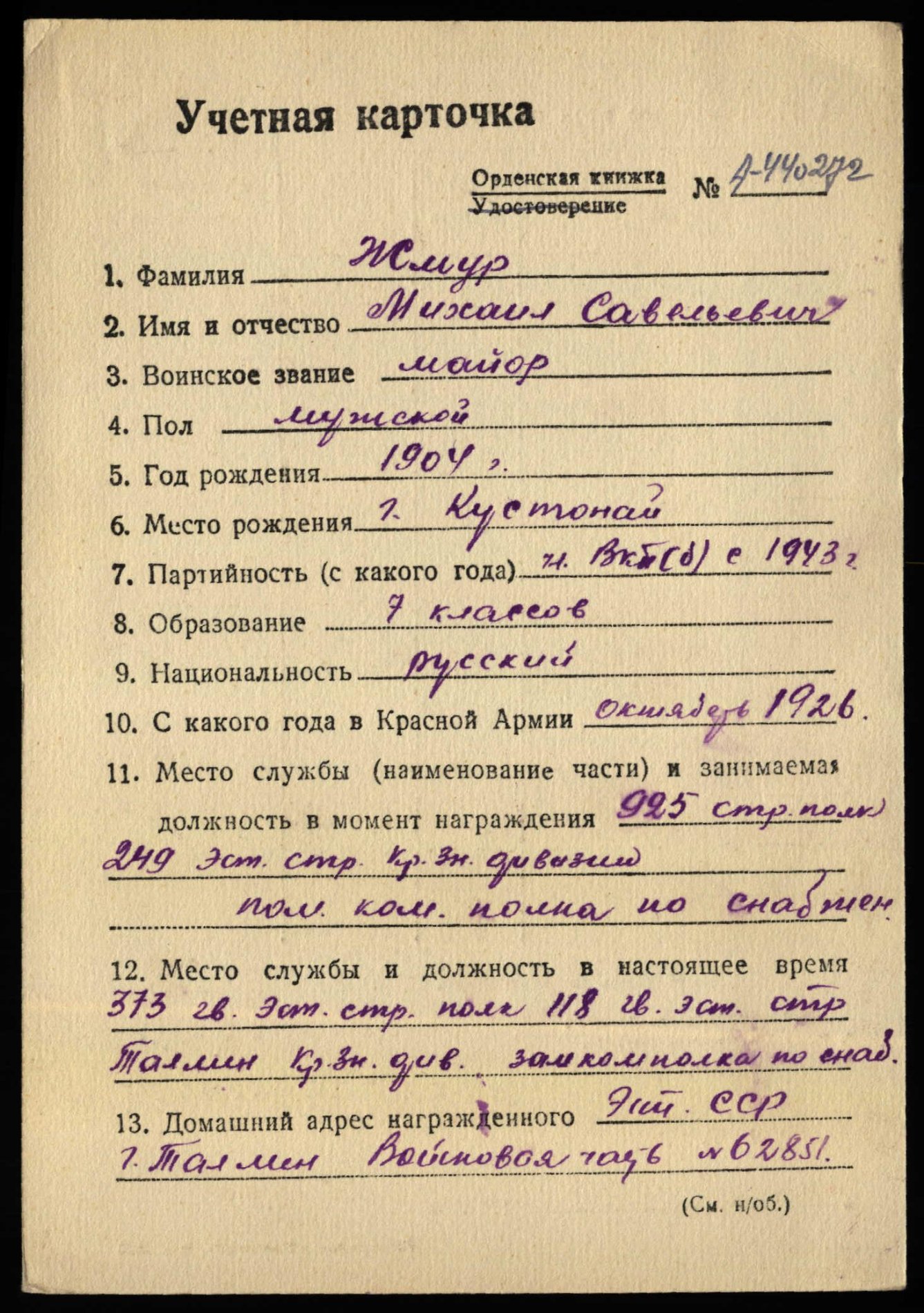 Major Mihail Zmur, 249. Eesti Laskurdiviisi 925. laskurpolgu komandöri abi varustusalal. Punatähe ordeni 1309156 kavaler. See orden (nagu ka autasulehel näha olevad Punalipu orden nr. 310781 ja Lenini orden nr. 203742) on antud talle Punaarmees väljateenitud aastate eest. Zmur on ka Isamaasõja II klassi ordeni nr. 427270 kavaler ja selle sai ta 1945. a märtsis Kuramaal, kus organiseeris väga rasketes tingimustes polgule materiaal- tehnilist tuge ning osaliselt ka lahingute eest mis toimusid varasemalt Eestimaa pinnal.