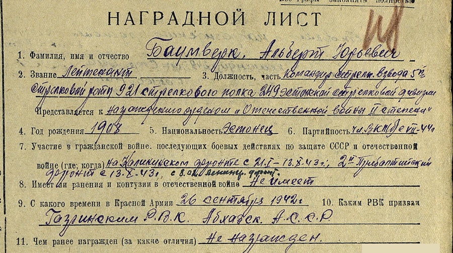Üle pika aja midagigi teemasse... Laskurkorpuse 370. Kaardiväe Laskurpolgu kaardiväeleitnant Albert Baumverki Isamaasõja II klassi orden. Krasnojarski krais, Esto- Sadok-i külas sündinud eestlane, kelle sõjatee tõi kodumaale tagasi.