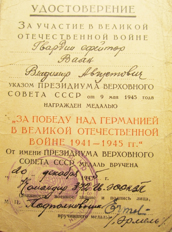 Laskurkorpuse 372. Kaardiväe Laskurpolgu kaardiväejefreitor Vladimir Vaan. Vapruse medali kavaler.