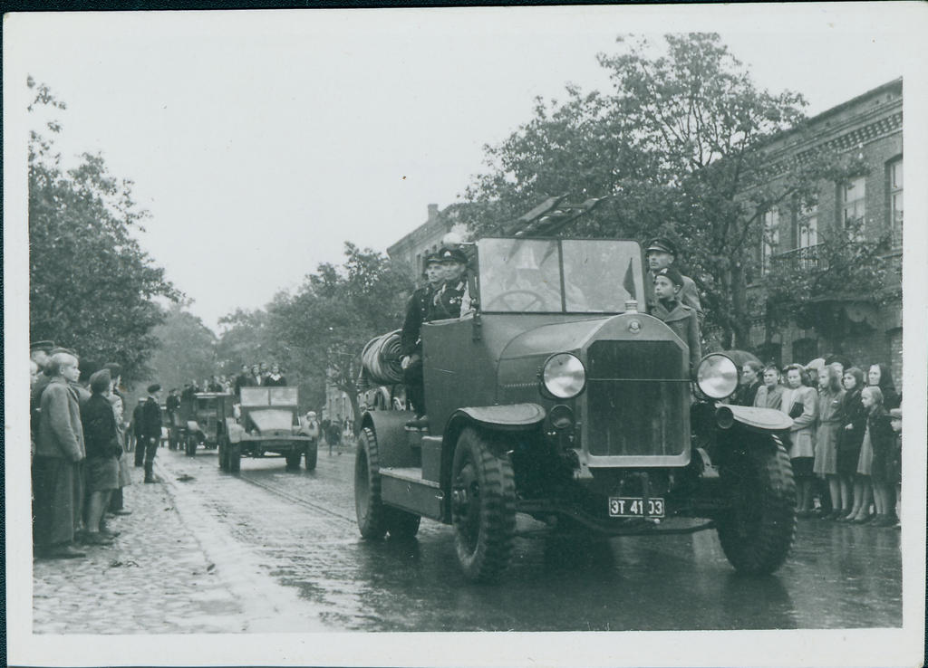 "Pärnumaa tuletõrje brigaadipäev: tuletõrjeautode defilee Rüütli tänaval, esiplaanil Pärnu linna II kompanii lendsalk, 1946.a." (Eesti Tuletõrjemuuseum via muis.ee)