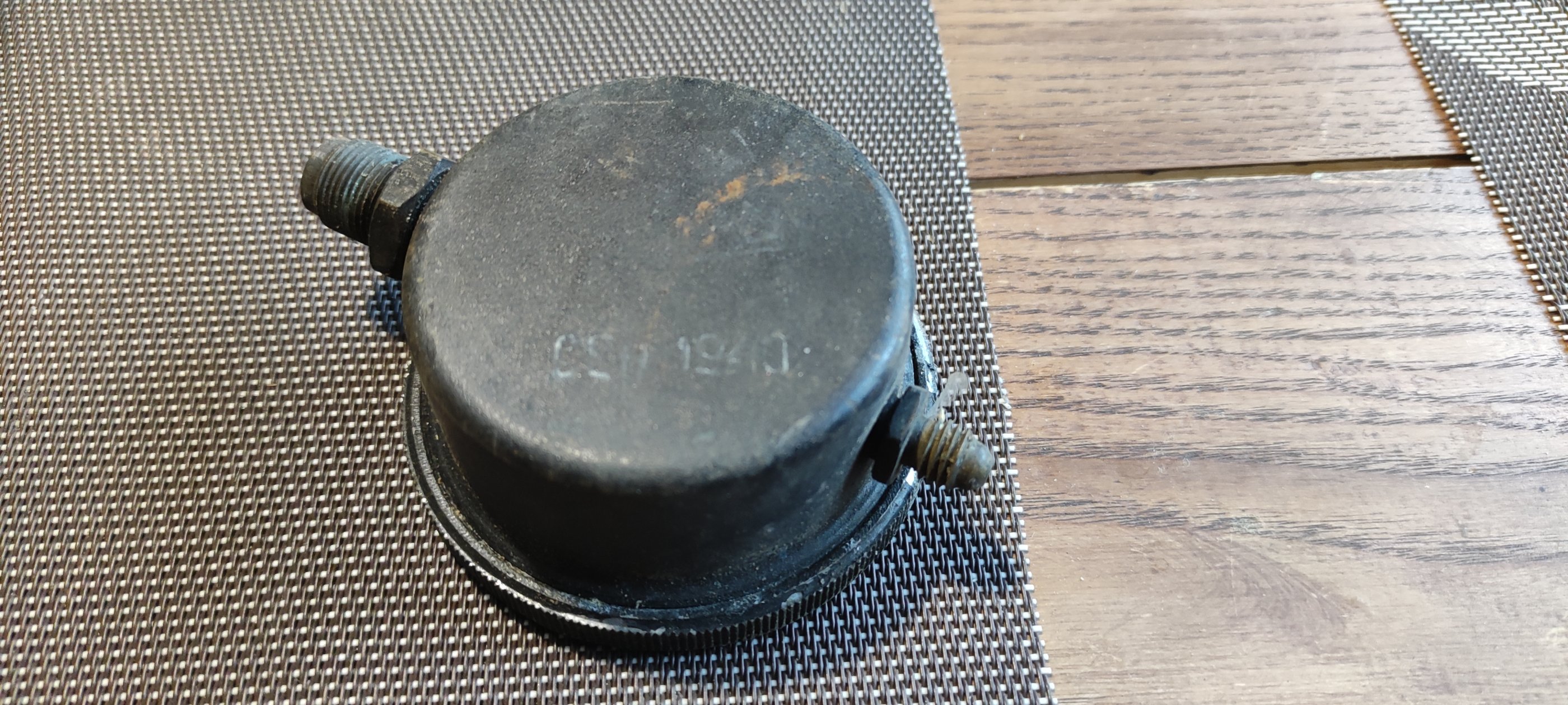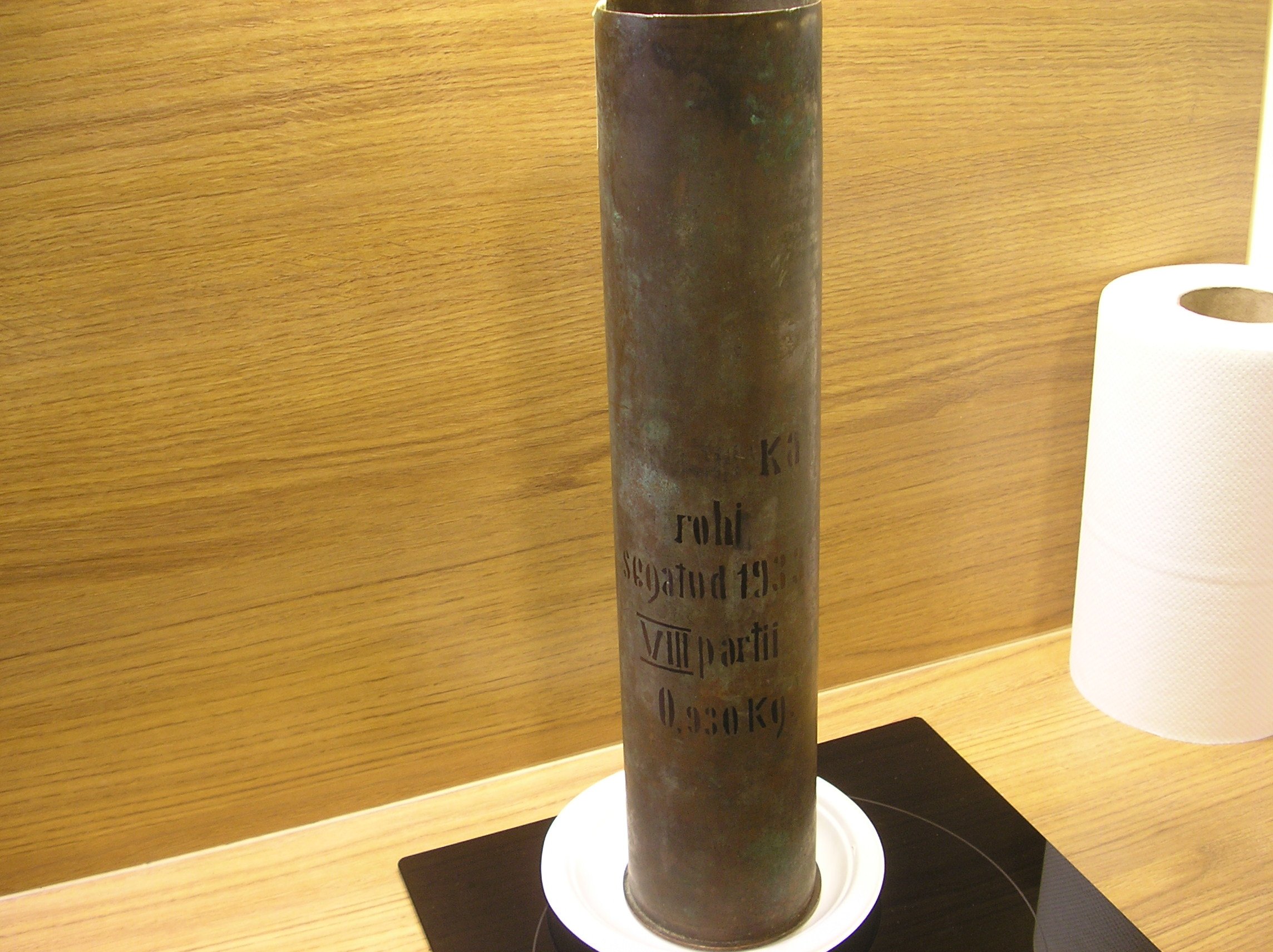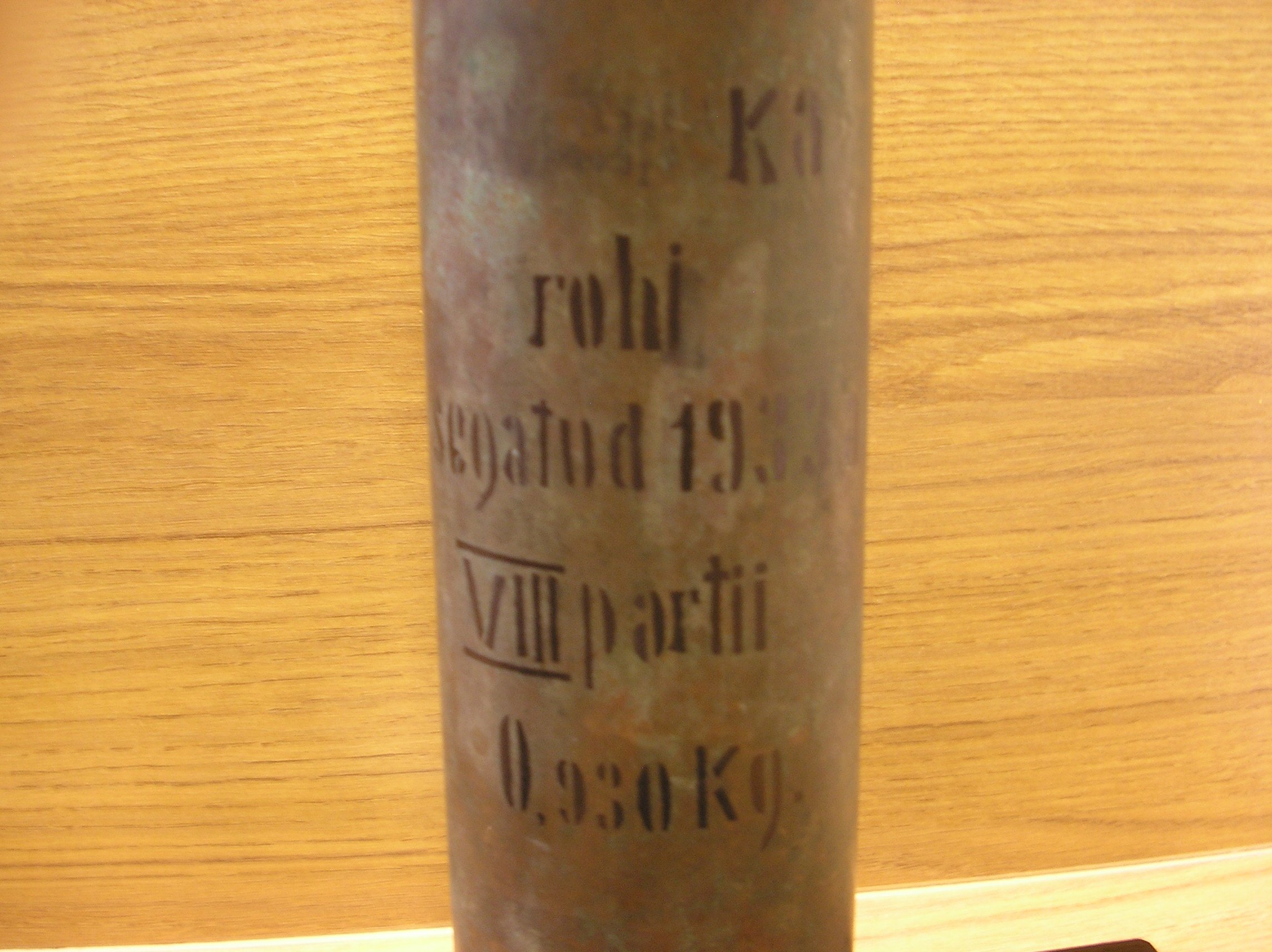 Mul on siin üks tavaline 76,2 mm hülss. Eestikeelsete kirjadega. Järsku keegi oskab ütelda mis sõna on esimesele reale kirjutatud. Jäljed on praktiliselt loetamatud. 4 viimast tähte on ilmselt r i k a