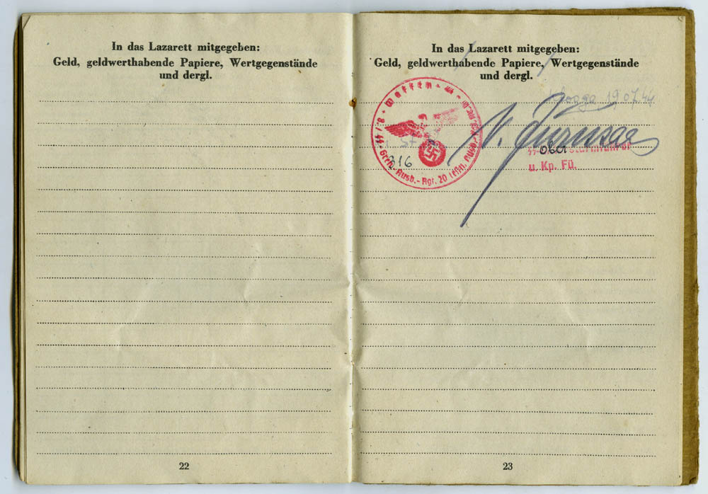 Palgaraamatus on mitu Ostuf. Valdur Jürissaare allkirja, kes oli 20. Tagavara- ja Väljaõpperügemendi II pataljoni 8. kompanii ülem.