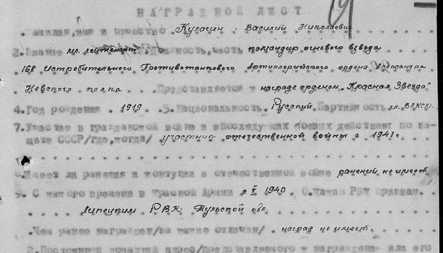 Lugupidamist vääriva vapruse eest sai nooremleitnant Kulagin selle Punatähe ordeni. Aprillis 1945, kui nende patarei Ziltendorfis vaenlase tule all ( linnulennult 100km Berliinini ) tulepositsioone sisse võttis, tabas vastase mürsk relvastust ja laskemoona vedanud veokit. Kulagin, riskides oma eluga päästis põlevast veoautost 2 raskesti haavatud lahingukaaslast...