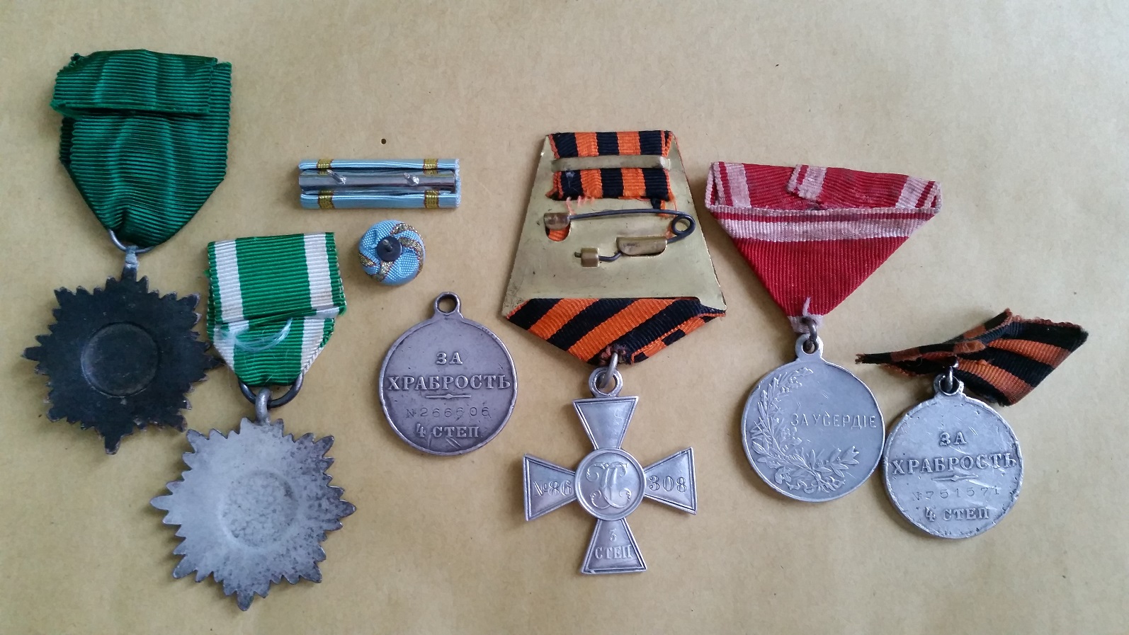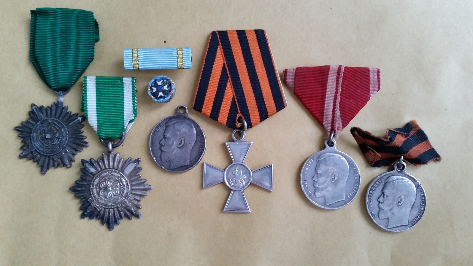 See 3. järgu Georgi rist jätab natuke kahtlase mulje - oled Sa kindel, et see on originaal? Risti taga olev lint on võetud Võit Saksamaa üle medalilt või Kuulsuse ordenilt, Za Useride lint on koopia. Läti Kolme Tähe ordeni lindilõige ja miniatuur on tänapäevased. Mõlemal Idarahvaste vaprusmedalil on vist ehtsad lindid - neid oligi minu teada kahes laiuses (samuti nagu Raudristi linte oli vähemalt kolmes laiuses).