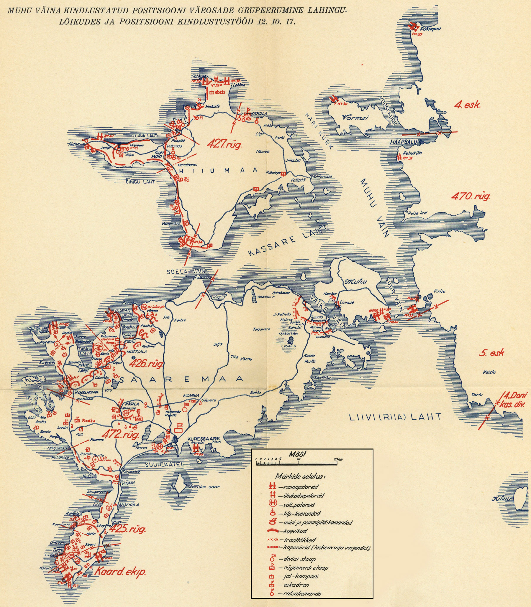Ajakirja "Sõdur" 3/2013 on 1917-1918 vormitunnuste artiklis öeldud, et dessandi ajal asusid Muhu saarel 1. Eesti jalaväepolgu I ja II pataljon ning "Colt" kuulipildujate komando ja enamik koosseisust (16 ohvitseri ja 1582 sõdurit) langes sakslaste kätte vangi. Nende I ja II pataljoni Muhu saarel asumise kohta oskab kasutaja Ben kindlasti midagi lähemalt rääkida. Nikolai Reek oma 1937. aastal ilmunud raamatus ei paiguta ühtegi jalaväeüksust Muhu saarele, seal on ainult rannakaitse-suurtükivägi ja õhukaitsepatareid. Samuti on segadus "Colt" kuulipildujate komando paiknemisega - kas asus Muhu saarel või 426. jalaväepolgu varus Meedla ümbruses? Hiiumaal asus 107. diviisi 427. Pudõži jalaväepolk ja üle Suure-Väina mandril oli 118. diviisi kuuluv 470. Dankovi jalaväepolk.