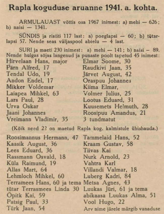 Rapla koguduse aruanne 1941. aasta kohta, sh. punaste poolt tapetud ja sõjas langenud 45 inimest.
