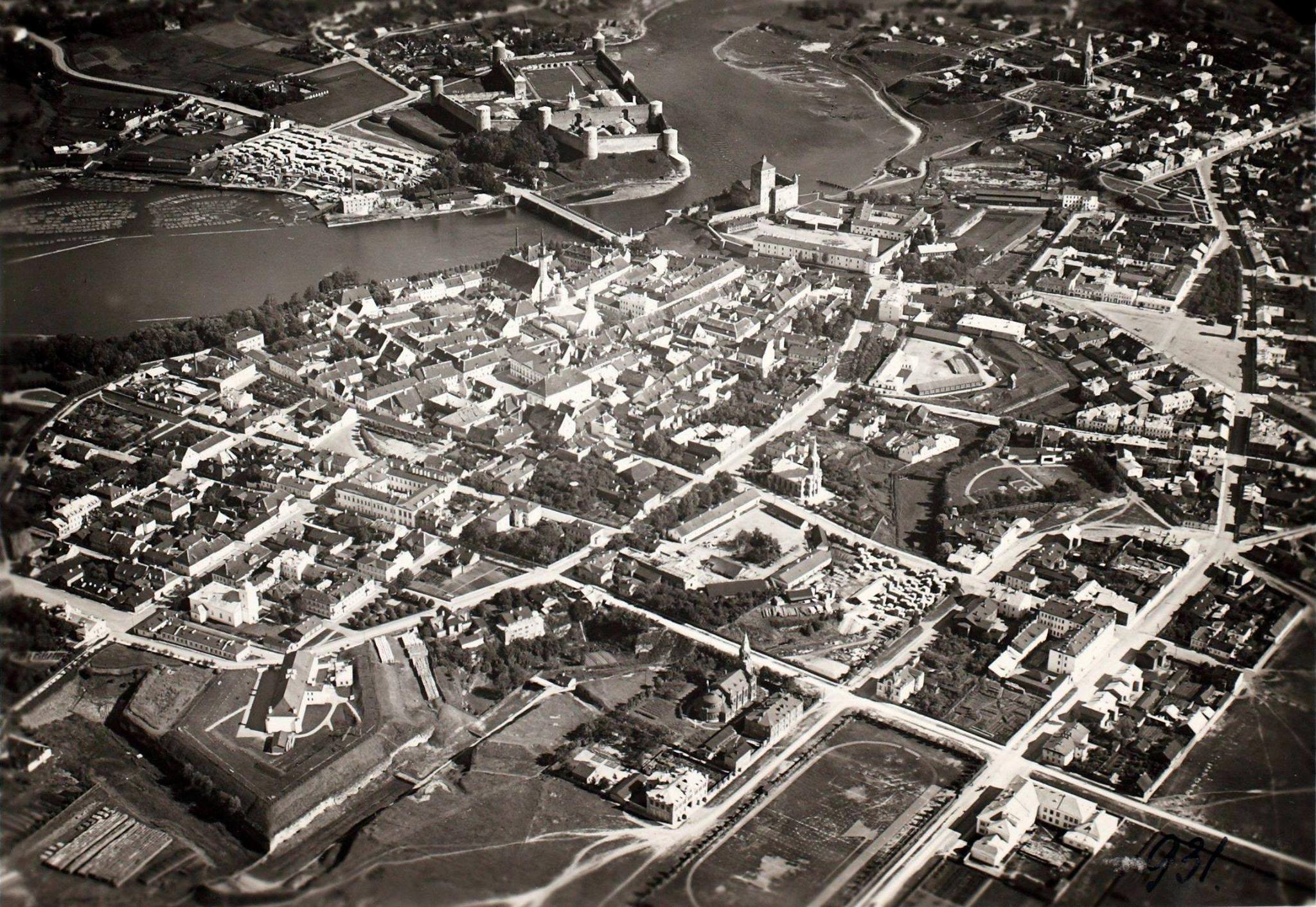 Pildistatud 1920. aastate alguses Hermanni kindluse hoovil valge hoone ees, taustal paistab Jaani kiriku torn.