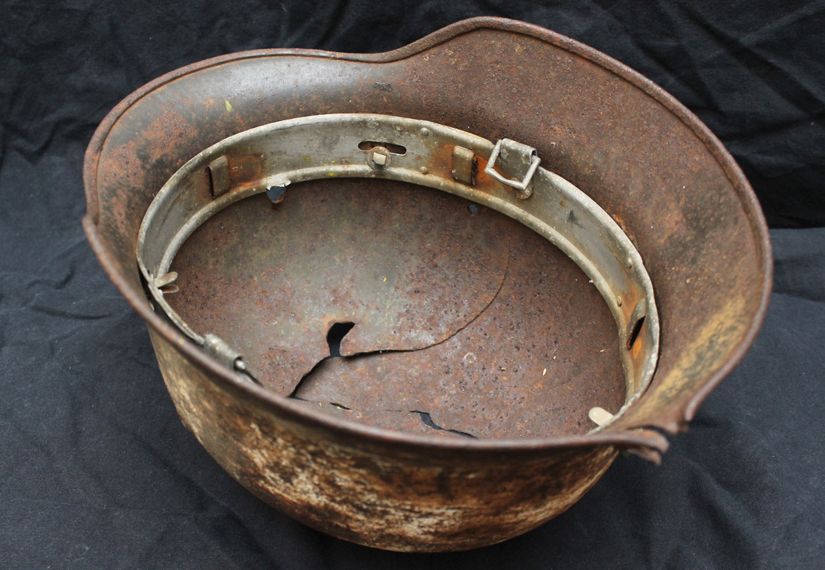 Kiivril on läbiv kuuliauk ja pealagi on lõhki. Tahaks kuulda arvamusi nende mõrade kohta - kas tegemist on mürsukillust tingitud vigastustega või on pigem on kahjustused tekitanud kiivris jäätunud vesi? Vasakul küljel on näha jälgi WH dekaalist ja sisemisel võrul on 1938. aasta markeeringud.