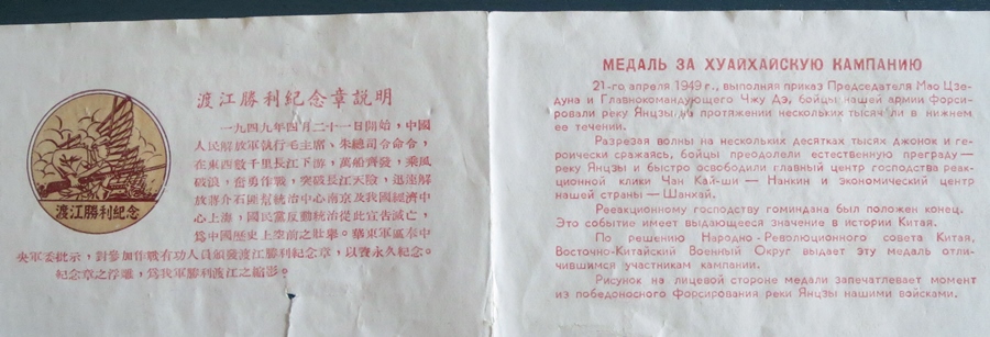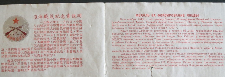 Lindiga medal on kirde Hiina vabastamise medal aastast 1948, püssidega medal on antud Yanzy jõe forsseerimise eest 1949 ja pruunikas medal on Huaihai kampaania medal 1949. aastast.