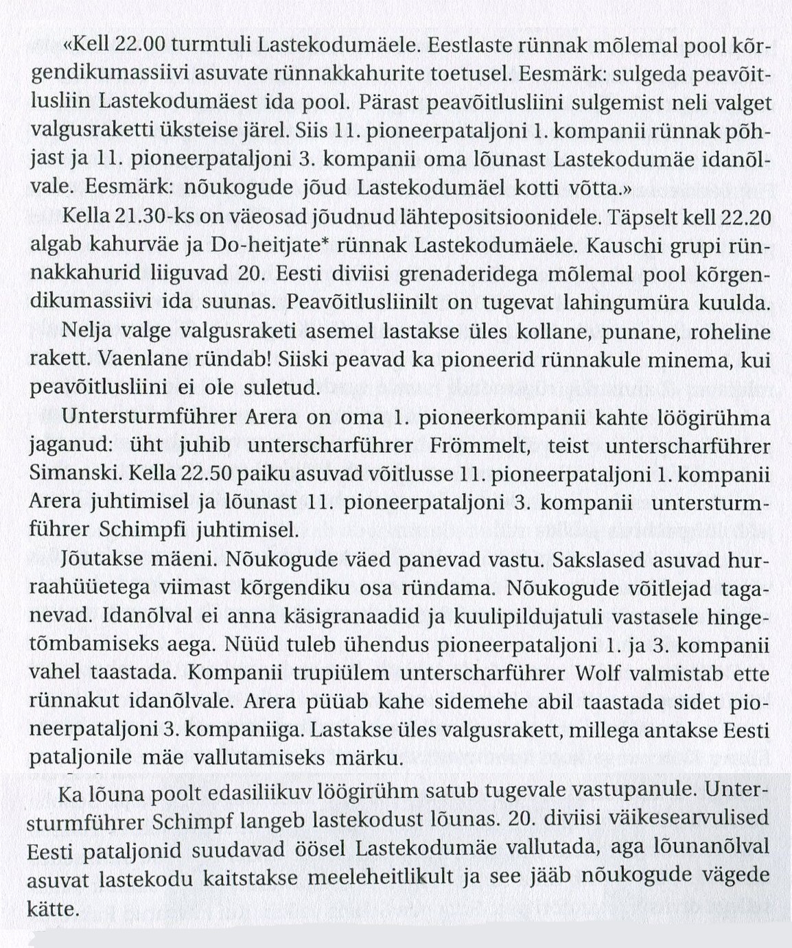 "Keskel oleva Grenaderimäe ehk Põrguhauamäe ja läänepoolse kõrgustiku ehk Tornimäe positsioonidele asusid eestlaste üksused (47. rügemendi III pataljon) ja kaks "Nordland" pioneerikompaniid (24. rügement).".