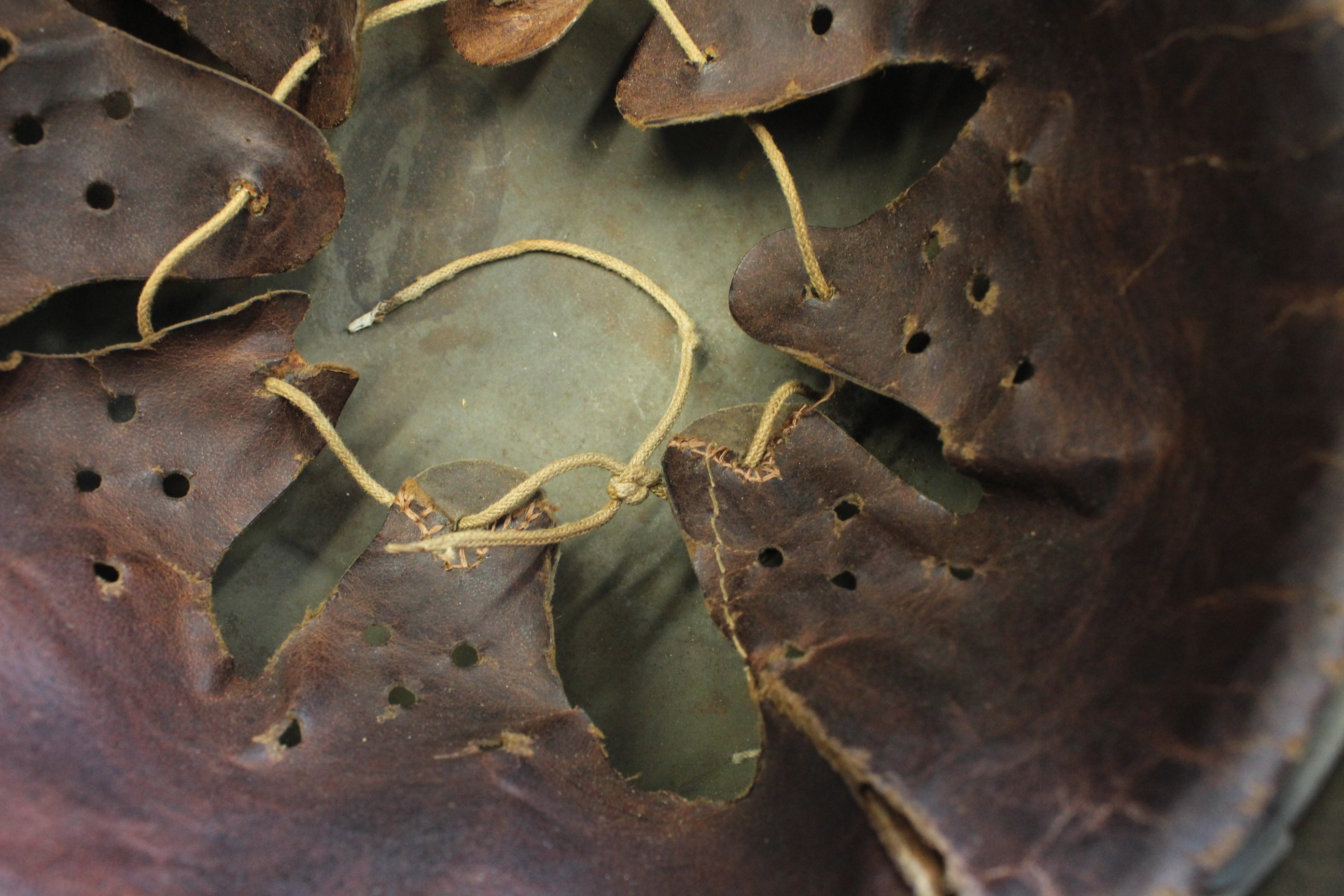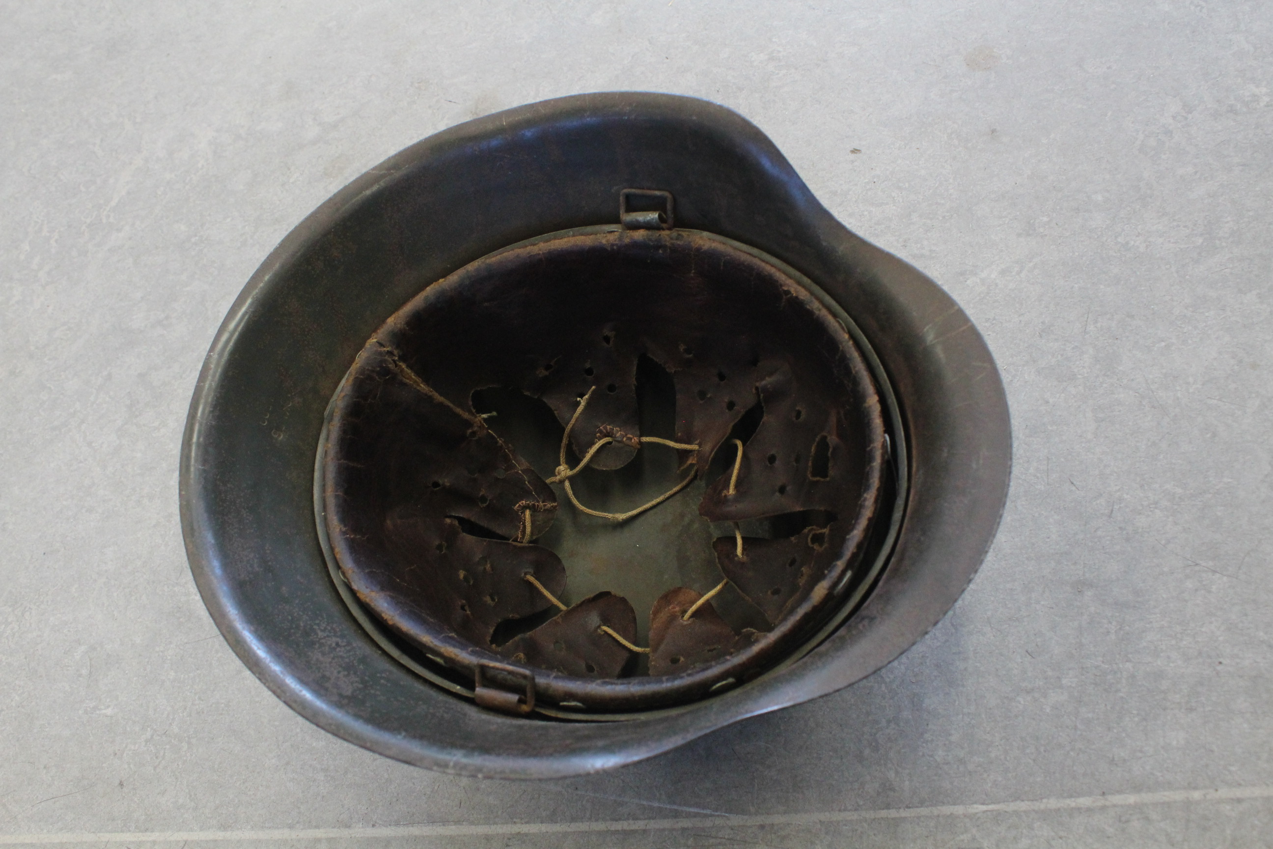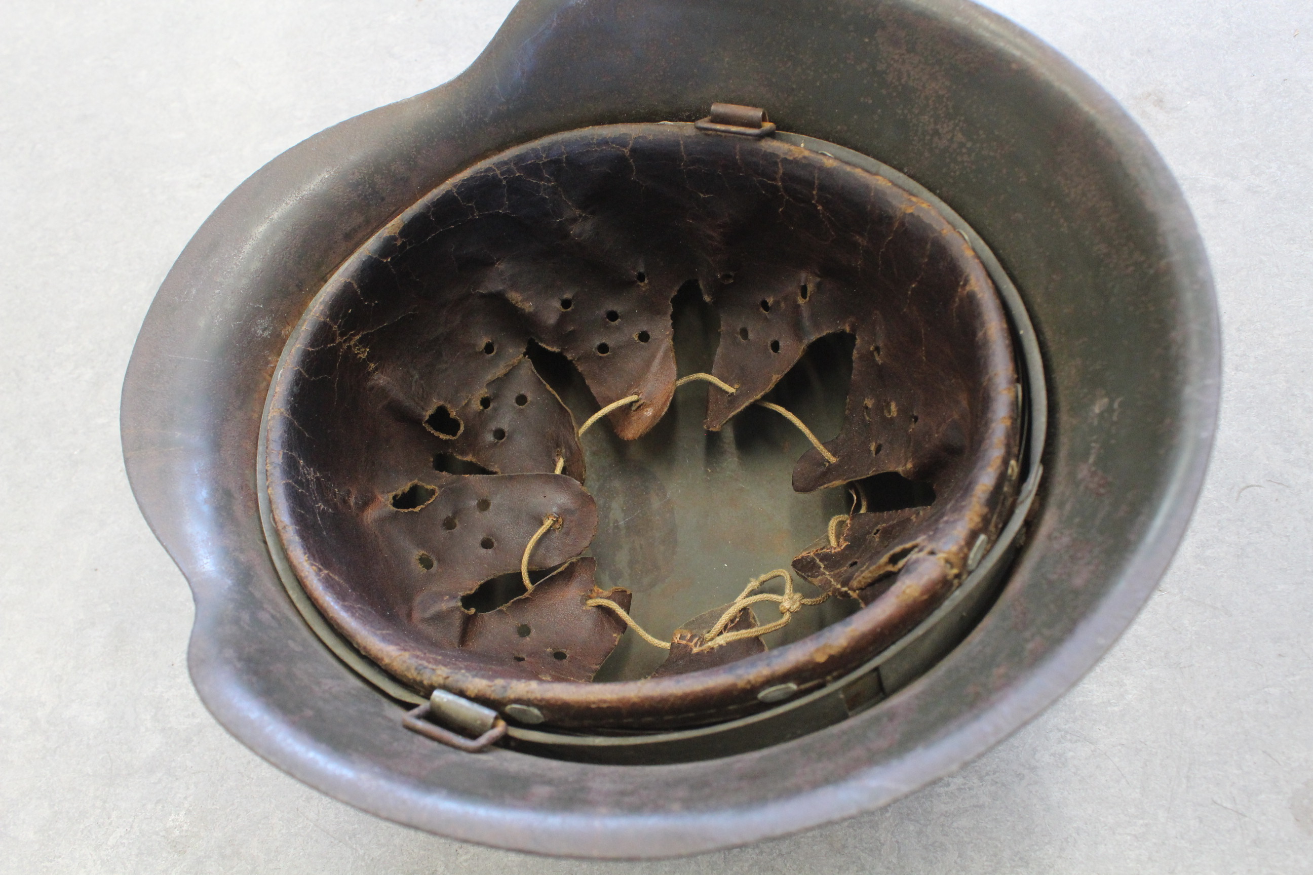 M 42 kiiver. Kunagi kleepisin SS-i vesikleepsu mille hiljem eemaldasin. Nahk on sees ok. Ei ole "baranka". Kaks "kõrva" oli otstest katki ja parandasin kunagi ära. Pildil näha. Nöör on sees originaal. Kiiver lebas kunagi Tallinfilmi pööningul.