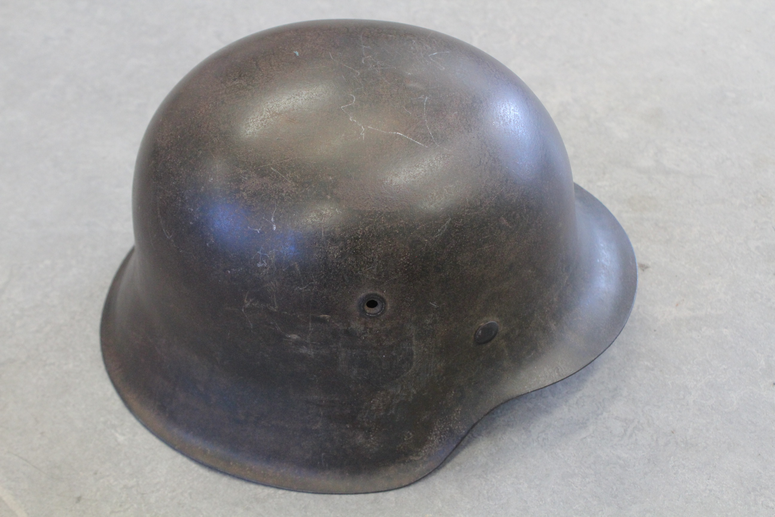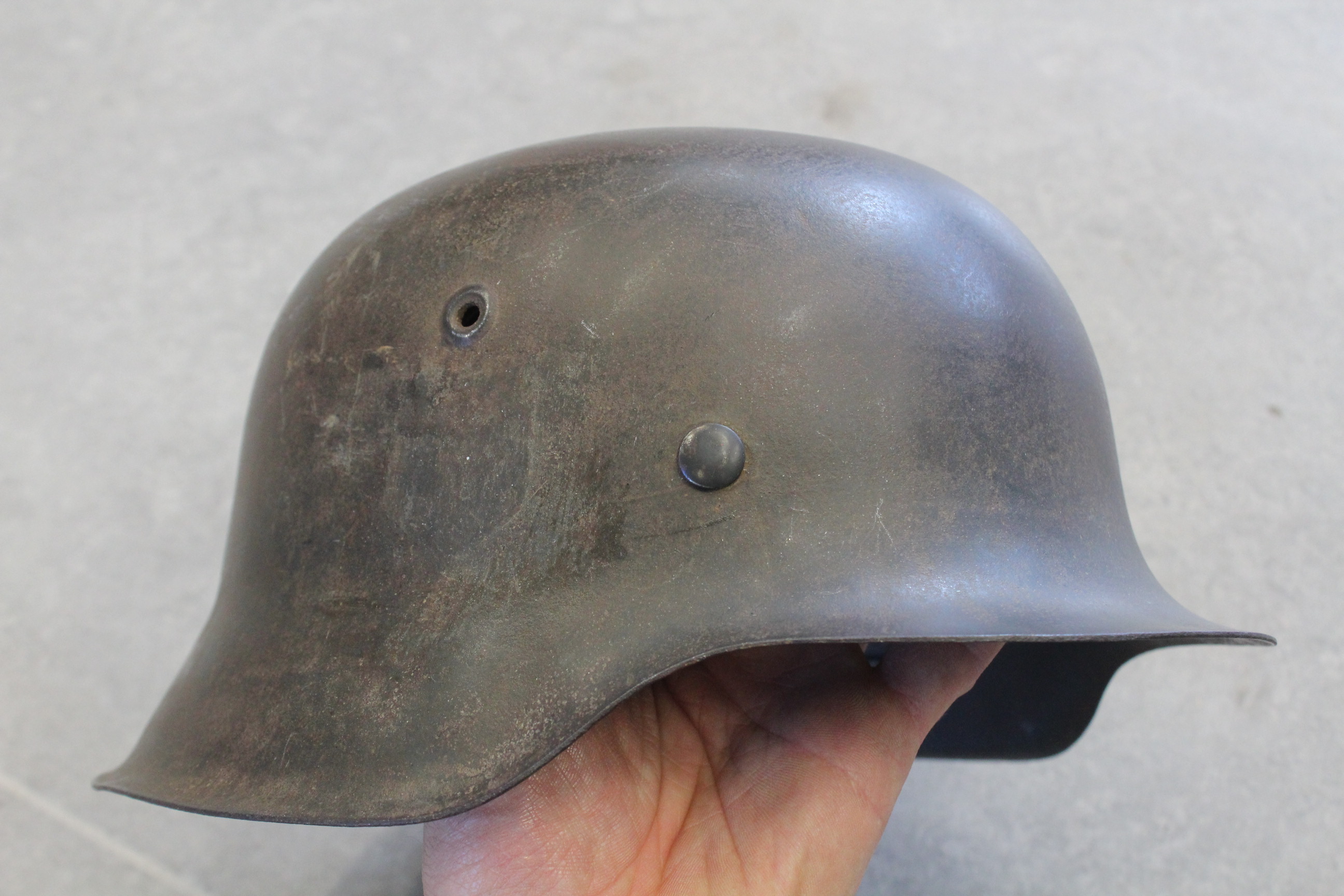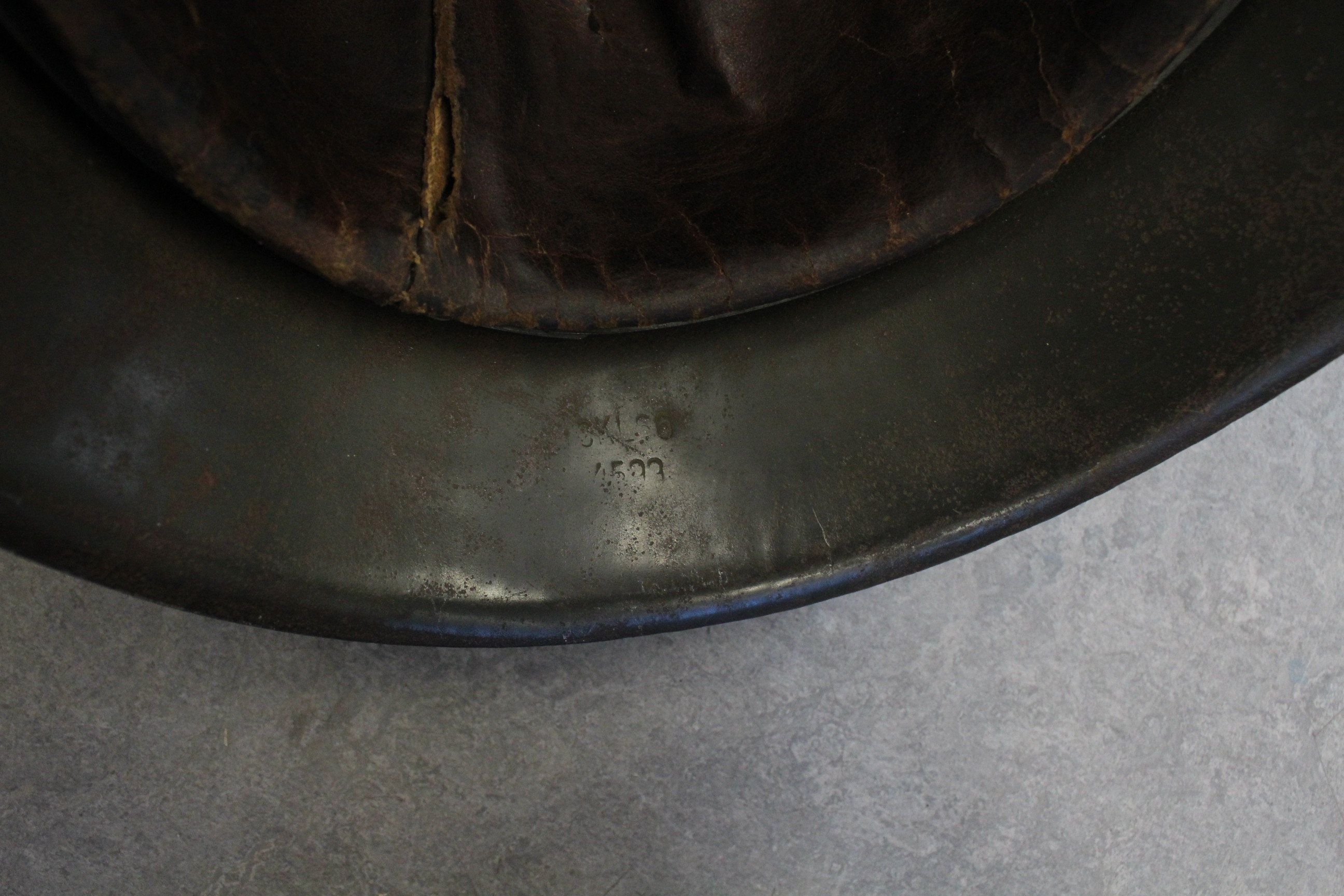 M 42 kiiver. Kunagi kleepisin SS-i vesikleepsu mille hiljem eemaldasin. Nahk on sees ok. Ei ole "baranka". Kaks "kõrva" oli otstest katki ja parandasin kunagi ära. Pildil näha. Nöör on sees originaal. Kiiver lebas kunagi Tallinfilmi pööningul.