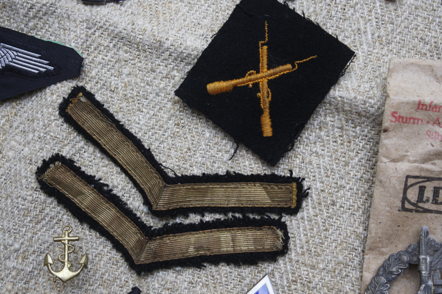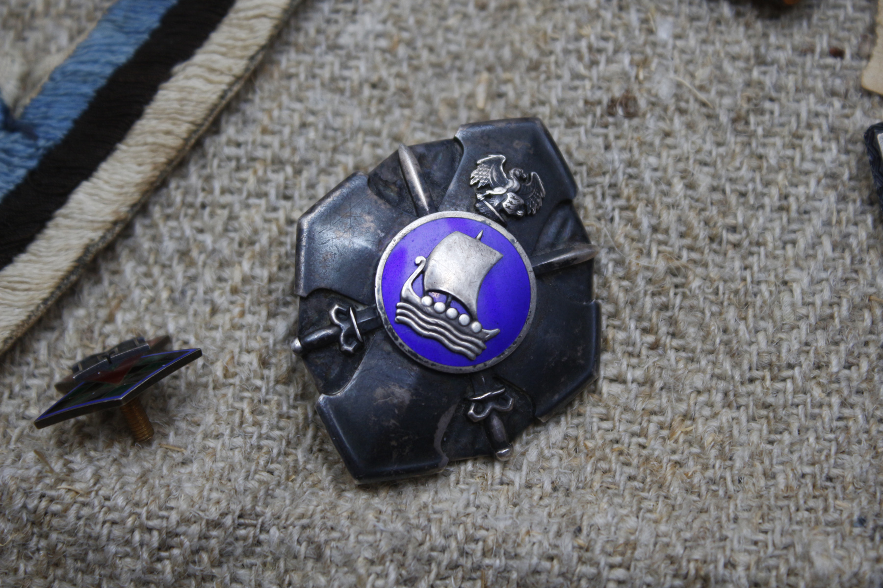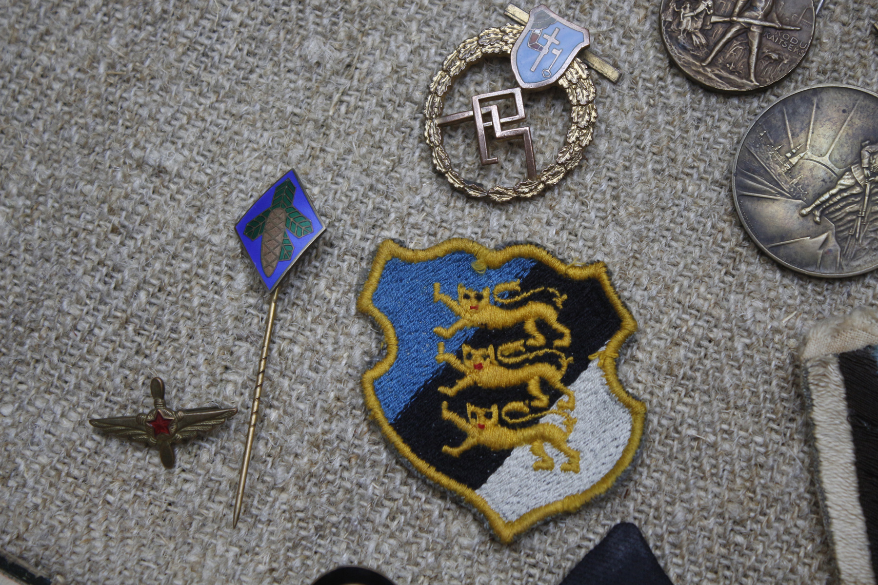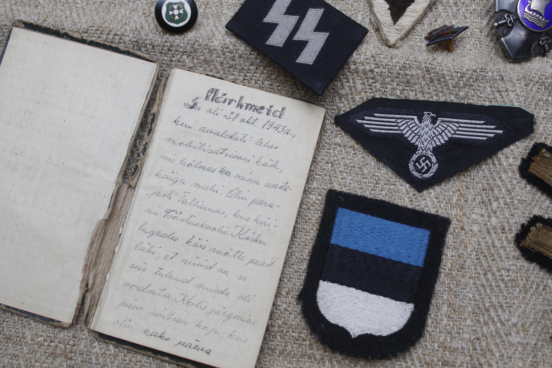 Kaitseliidu Saaremaa maleva rinnamärk kuulus Pöidest pärit Aleksei Truumets'ale (Truuvert), kelle elu lõppes 1948. aastal Venemaal vangilaagris. Vasakul olev märkmik, välkudega kraenurk, kotkas ja Dachau kilp olid Sturmgeschütz Abteilung 20 ridades teeninud Grenadier Ülo Käbin'i omad. Pildi keskel olev lõvidega kilp, märkmik, mansetinööbid ja vangilaagri toitlustuskaardid kuulusid Elmar Kanep'ile. Mees mobiliseeriti Punaarmeesse ja oli Tšerbakulis kui formeeriti Eesti laskurdiviise (sellest ajast on ka märkmik). Ilmselt Velikije Luki all jooksis üle, istus natuke aega vangilaagris ja teenis hiljem ühe Politseipataljoni ridades. Vabadussõja aegne Kalevlaste Maleva embleem, Vabadussõja mälestusmedal & 10. aastat Läti VS'ist kuulusid Karl Müller'ile. Päris Vabadussõja lõpus ülendati ta vanemallohvitserist ohvitseri asetäitjaks. Vasakus servas olev kolme lõviga kilp oli Valter Kivioja oma. EW mereväe auastmetunnused ja riviala eraldusmärk kuulusid Oskar Ferdinand Allik'ule, kelle teenistusaeg jäi 1930-ndate keskele. Paberkotiga jalaväerünnak, käisekilp ja kaks EW mütsimärki kuulusid hilisemale Hauptstufmührer Theodor Liht'ile. Käisekilp on eeldatavalt ajast kui ta teenis Rebase pataljonis kompaniiülemana.