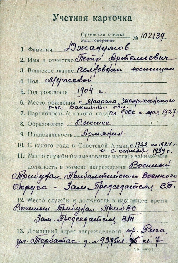 Balti sõjaväeringkonna sõjatribunali esimehe asetäitja, justiitspolkovniku Pjotr Dzanumovi Isamaasõja orden I klass nr. 61630. Mille eest ta selle konkreetselt sai, ei õnnestunudki kahjuks hetkel välja uurida.