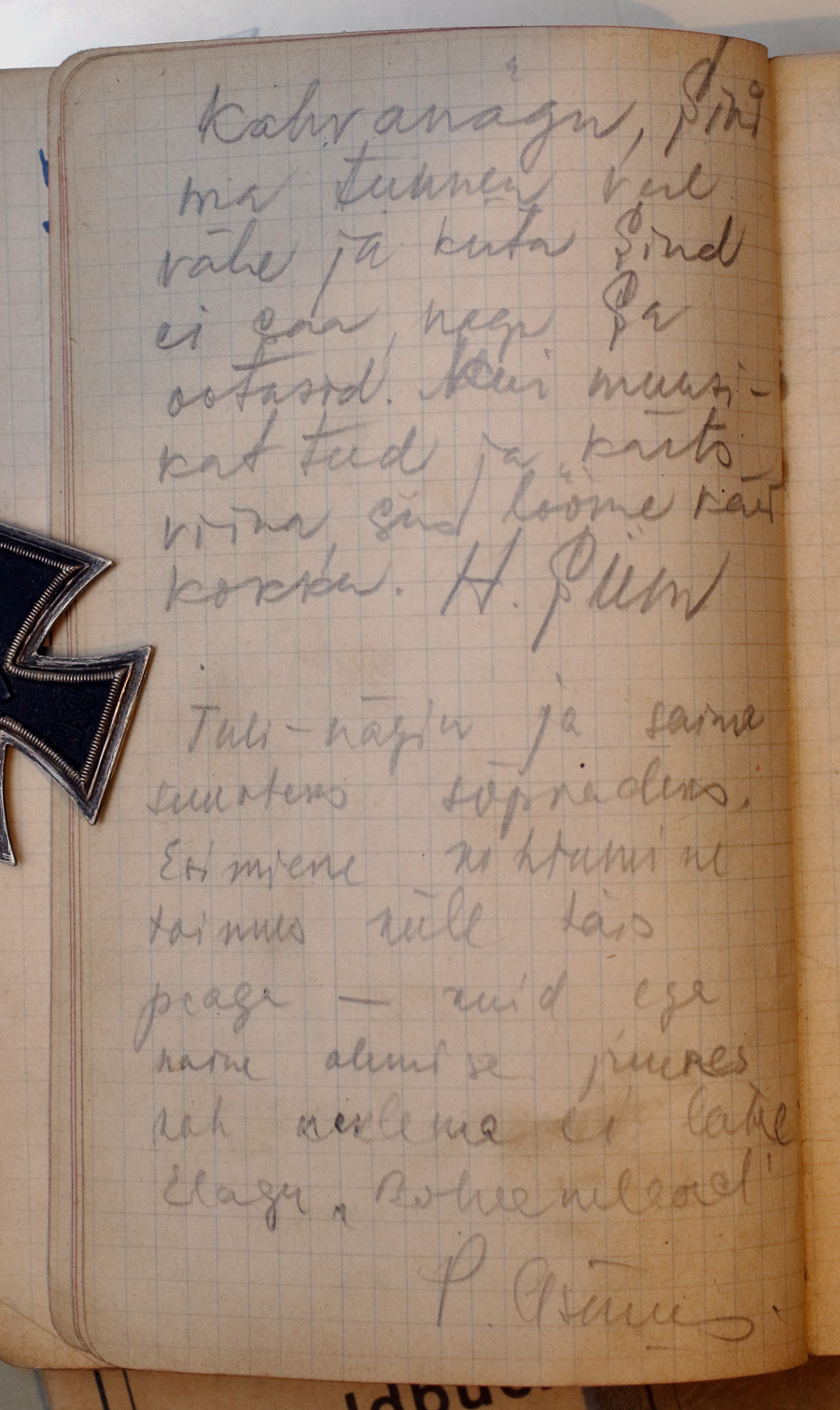 Üks sakslane aitas välja lugeda: "zum Andenken an die 5. Kriegsweihnacht wünscht Ihnen, angesichts des Feindes am Dnjepr, das Beste, ihr FrontKamerad und ehemaliger Kp.(Kompanie) Führer 5./Estn.(ische) SS - Legionuscha kirjutas:Esimese sissekande lugemisel vajan abi ...