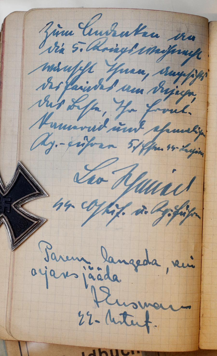 Viimase sissekande on teinud SS sõjakirjasaatja Peeter Asmus ja kirjutatud on: "Tuli - nägin ja saime suurteks sõpradeks. Esimene kohtumine toimus küll täis peaga - kuid ega kaine olemise juures ka kaklema ei lähe. Elagu "(???)". P.Asmus."
