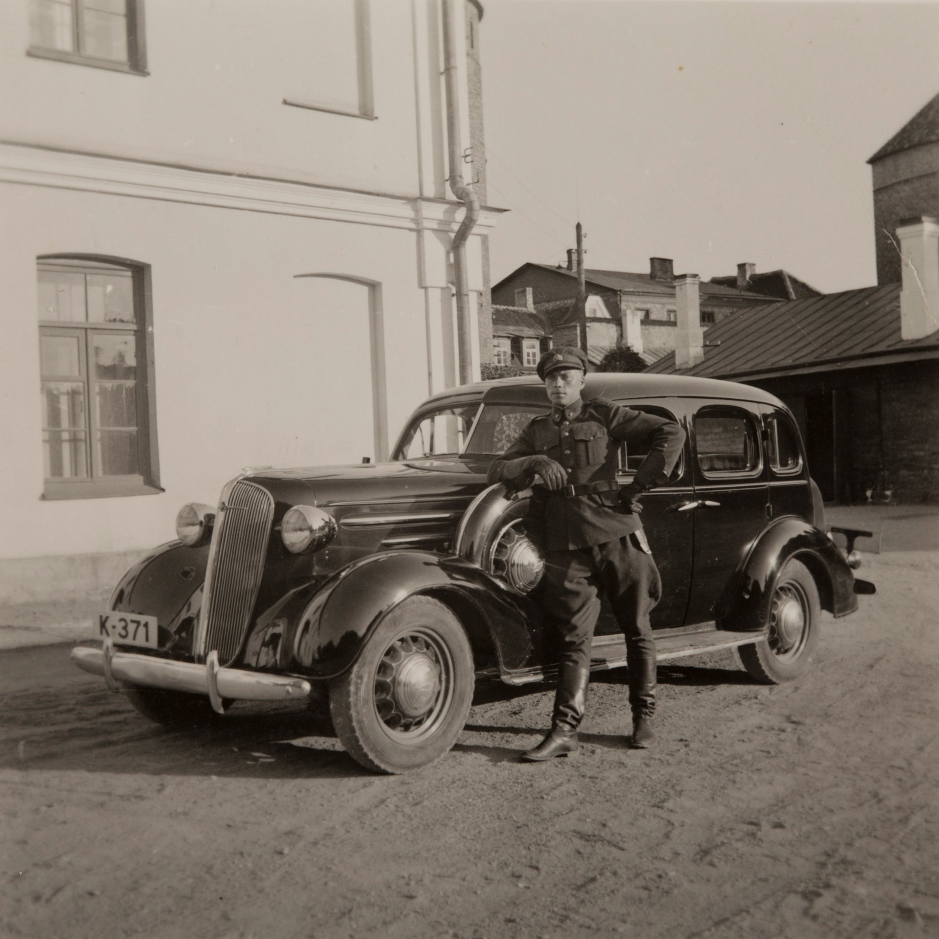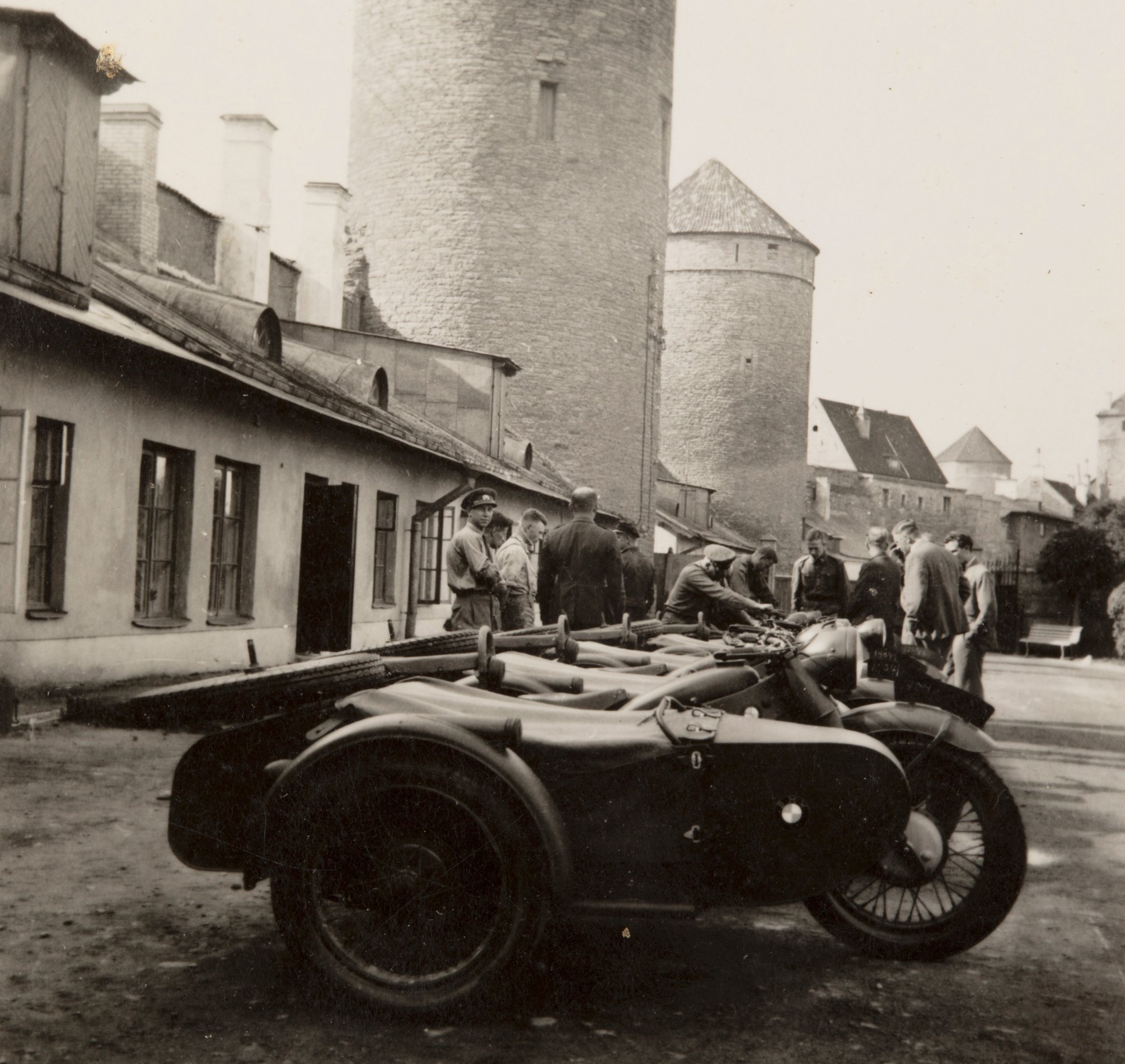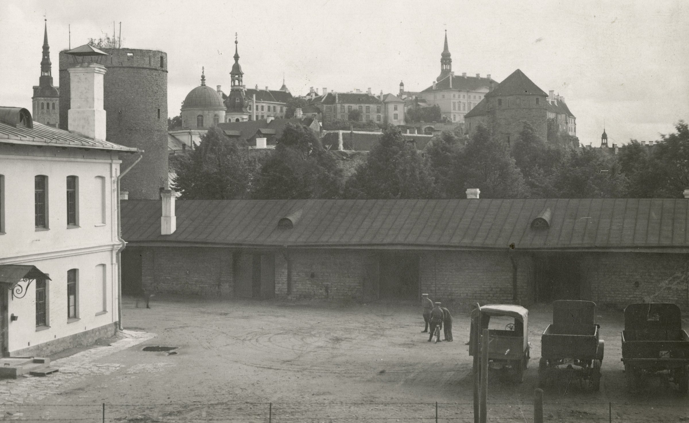 Hoonete vahelisel platsil on näha kolm külgkorviga mootorratast, Auto-Tanki rügemendi Autokompanii sanitaarauto Dodge-Brothers (K-244) ja mitu ürgse välimusega veomasinat. Pildi ülemisse serva jääb Rannamägi.