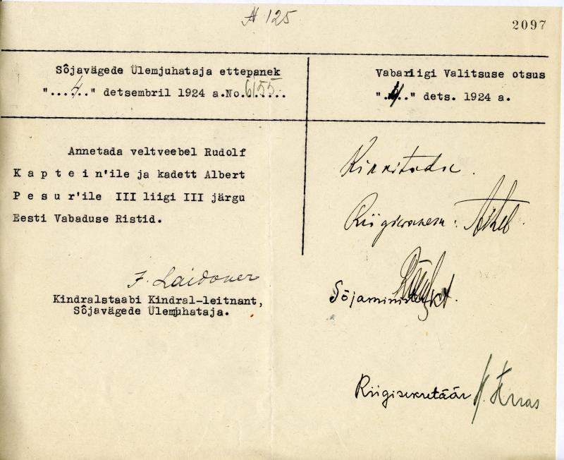 nii ongi. See on sõjaministri käskkiri kes anna loa sõjaväelastele. Tõenäoliselt on olemas ka Valitsuse otsus samal teemal.