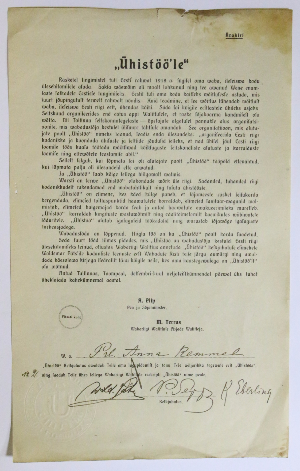 "Ühistöö" tegevust hinnati kõrgelt, kuid siiski vaid Ü keskjuhatuse esimees Voldemar Päts VR III-2 sai vääristatud Vabadusristiga.