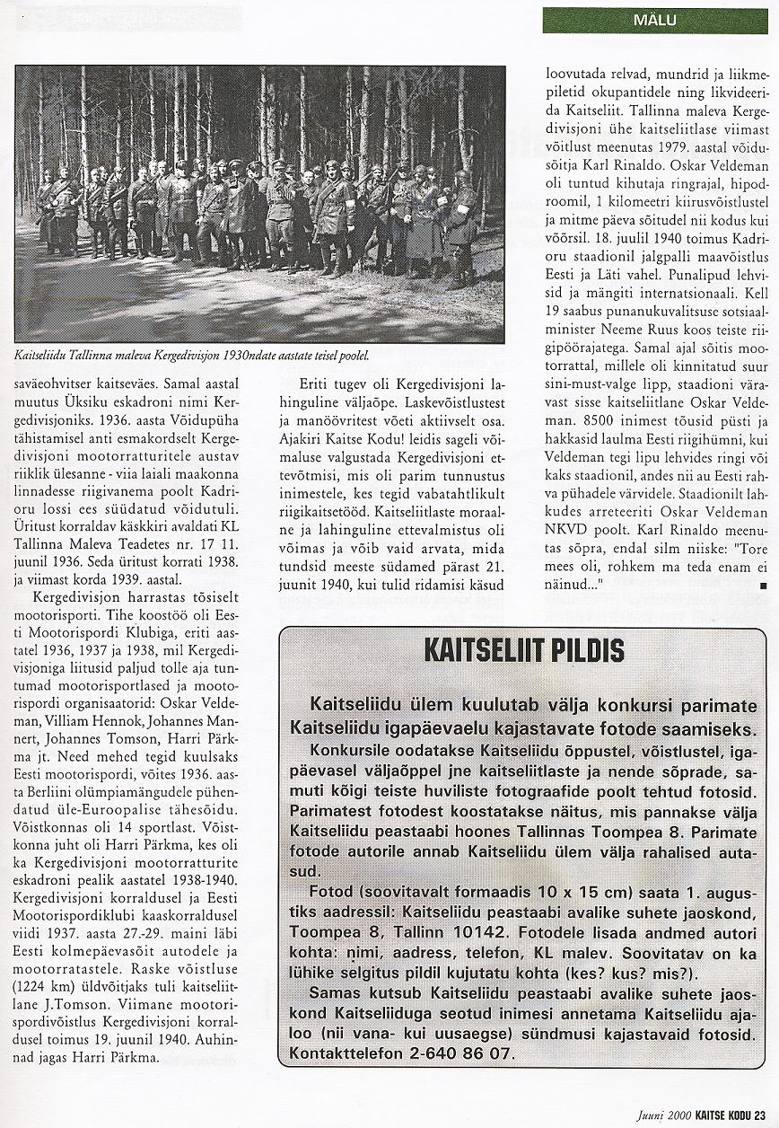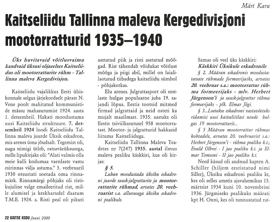 LoCo kirjutas:Eesti mootorrattaajaloo uurija ja tsiklikoguja Märt Karu on kirjutanud artikli "Kaitseliidu Tallinna maleva Kergedivisjoni mootorratturid 1935-1940" (ajakiri Kaitse Kodu. 2000.a. III. Lk 22-23).