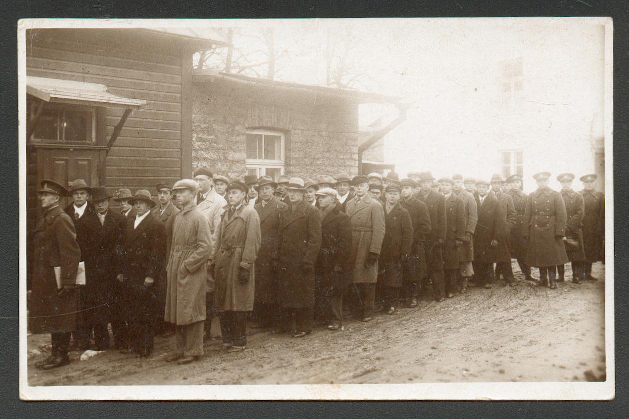 Mehed on vist äsja oma vormiriietuse selga saanud ja annavad parasjagu oma tsiviilriideid ära, kahel kõige ees seisval mehel on selgelt näha käes olevad kingad ja musta tooni riided.