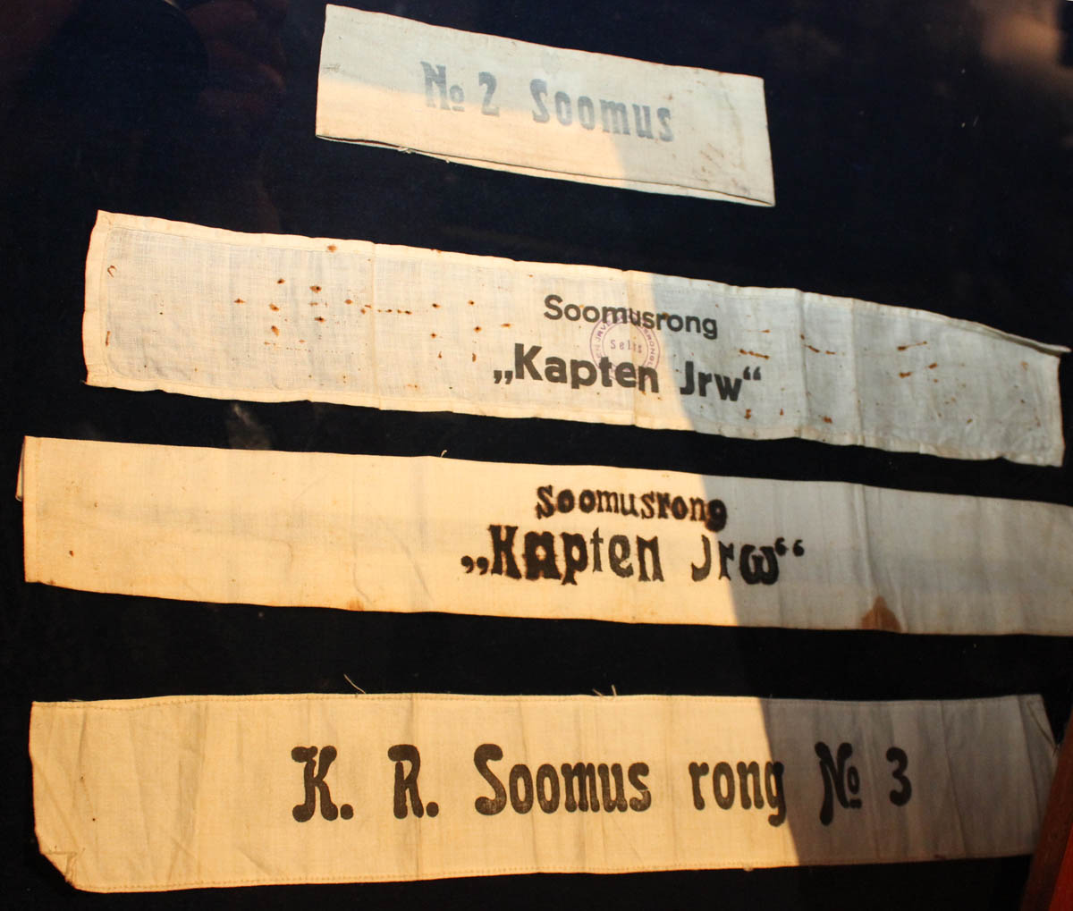 Järgmise lindi puhul ilmselt võimatu midagi kindlat väita - võib vist ainult oletada ja minu oletus on, et tegu võib olla Vabadussõja aegse käiselindiga. Valmistamisaeg jääb kindlasti enne Teist maailmasõda, ühepoolne trükk väga õhukesel kangal (kumab teisele poole läbi) ning kahes küljes on õmblusjäljed. Lindi laius 10,5 cm. Viimasel fotol midagi sarnast näha.