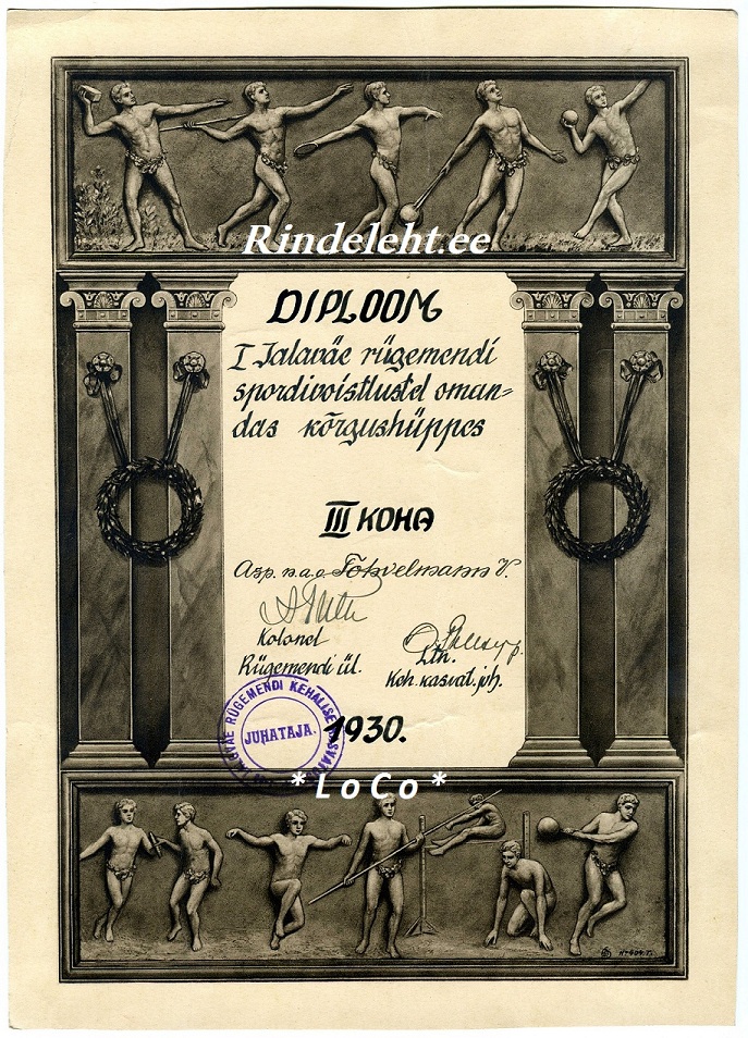 Valter Ferdinand Tohvelmanni 1.jalaväerügemendi spordidiplom.