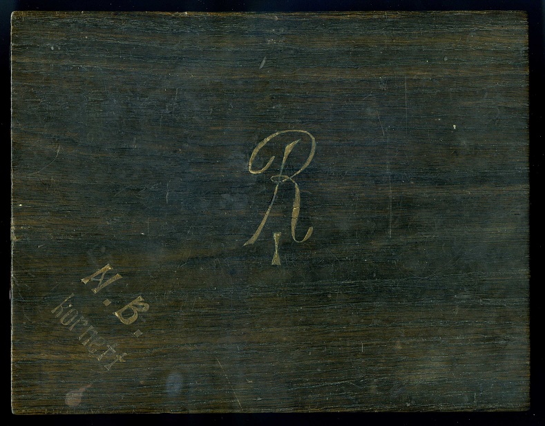 Ja samale mehele kuulunud puidust karp. Peal "R I", "N.B." (omanik Nikolai Borisov) ja "kornett".