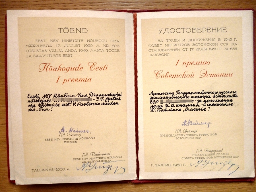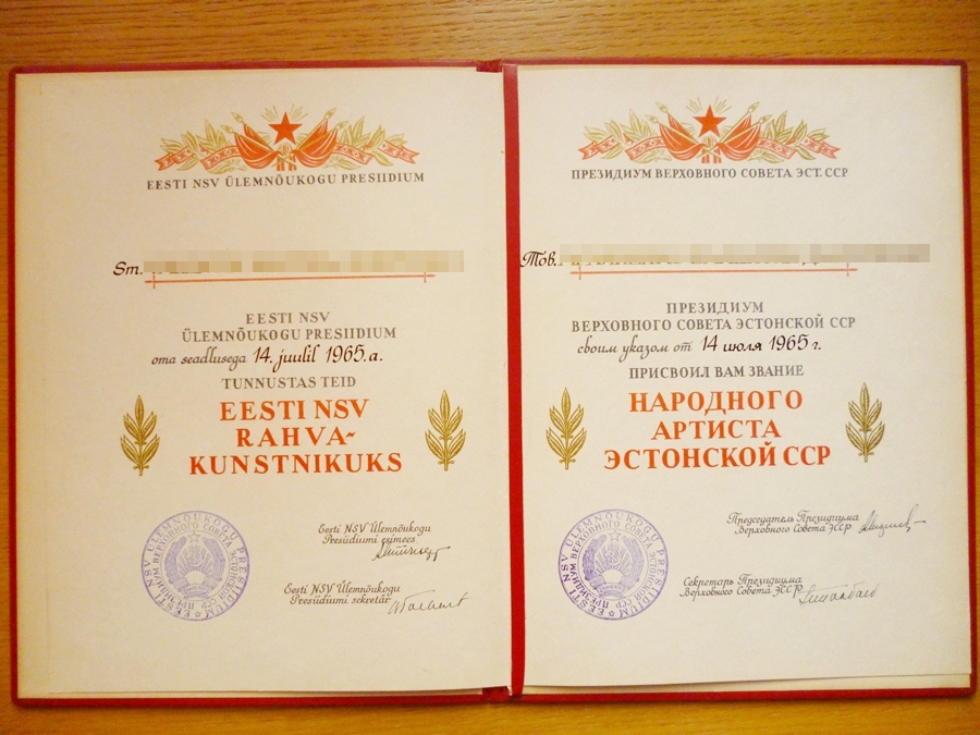 Samas õnnestus mul mõned aastad tagasi saada ka eestlasele antud NSVL Rahvakunstniku dokument koos karbi ja medaliga. Aga sellest kunagi hiljem.