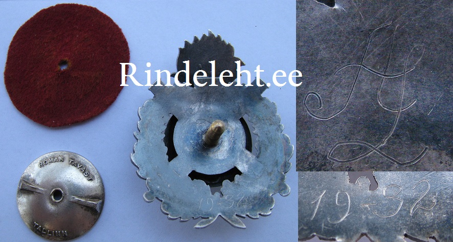 Taha on graveeritud "1932" ja initsiaalid "A L". Lisaks on märgile punane kangas taha pandud.
