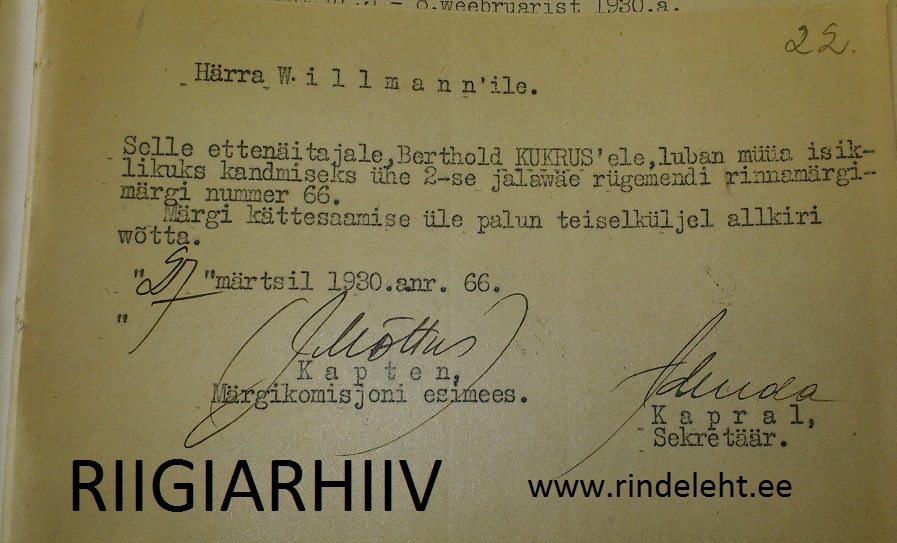 Märkide nr. 65-71 kohta olid arhiivis märgi ostuload, mis olid mõeldud esitamiseks äripidajale härra Willmannile (Johannes Villmann), kus on ära mainitud, et kes ja mis numbriga märgi võib osta.