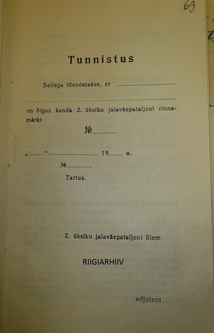 2. üksiku jalaväepataljoni rinnamärgi tunnistus. G.Roht-i trükk, Tartus 1928.