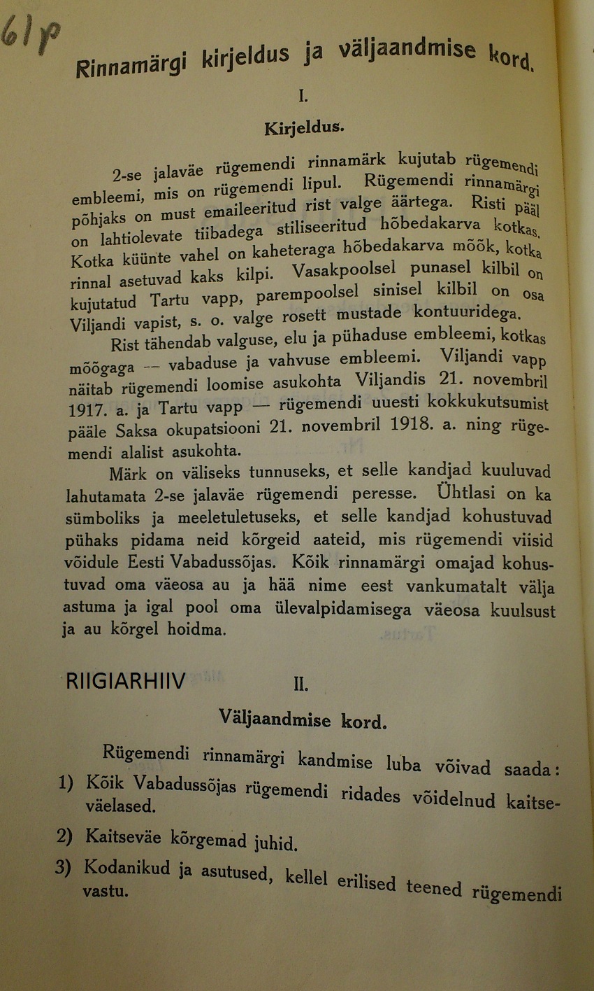 2.Jalaväerügemendi rinnamärgi annetamise kohta käiv kirjavahetus ja 2.Üksiku Jalaväepataljoni rinnamärgi põhikiri ERA.540.1.138