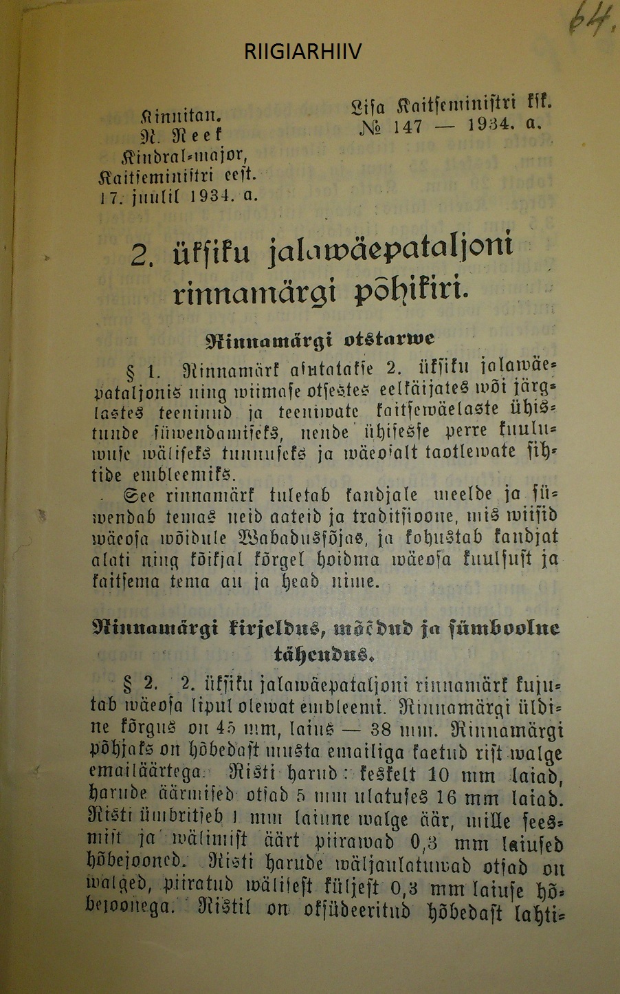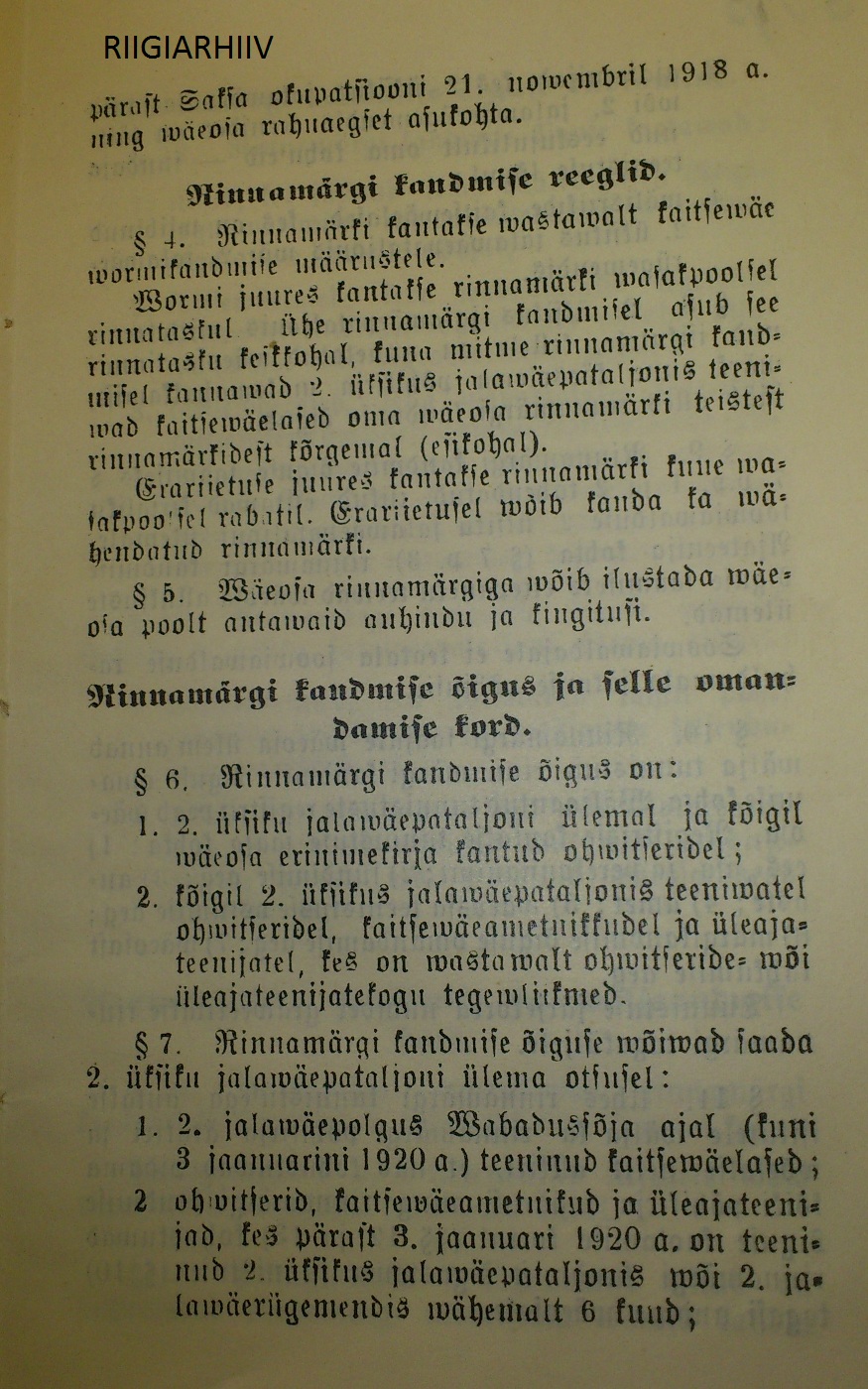 2.Jalaväerügemendi rinnamärgi annetamise kohta käiv kirjavahetus ja 2.Üksiku Jalaväepataljoni rinnamärgi põhikiri ERA.540.1.138