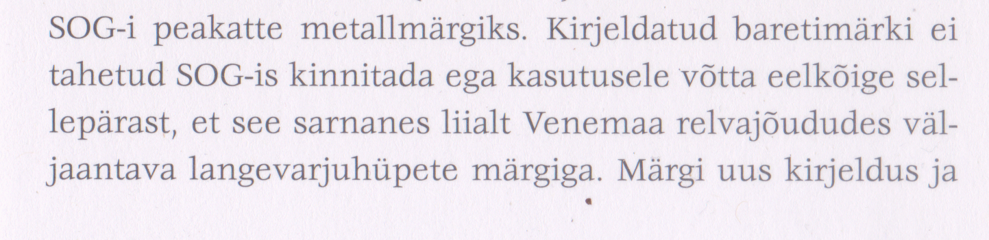 Kunagi käisin ka siin lihtsalt lugemas, nüüd ostsin raamatu ja hetkel lihtsalt sirvides torkas see märk silma, samasugune põlvepeal SOG graveering kah muide. Seega, loodan, et see märk pole kuhugi kadunud, sest teema püstitaja hoiab enda käes üsna haruldast märki! Mõni üksik proovieksemplar.