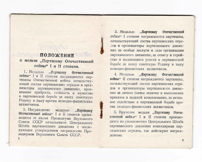 Kuna II klassi medalit, mis oleks meil siin välja antud ette näidata ei ole, siis seniks medal, millega on autasustaud Valgevene partisaniliikumisest osavõtja. Komplektis ka partisani tunnistus.