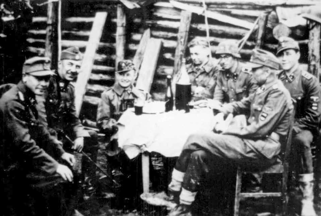 Richard Säägi "Minu sõjamälestused", lk 23 on foto samast üritusest (seal nimetatud kui nõupidamine Maitla punkris). Vasakpoolne on ltn Unt, Maitlast paremal aga ltn Heine, veebel "Habe", ltn Niidre, kpt Tepner (siinsel fotol Tepner puudub).Shiim kirjutas:Paremal võiks olla Harri Niidre?otofoto kirjutas:Aga kes suudab sellelt pildilt tuvastada isikuid peale Paulide. Kes võiks see vunts olla ja tuttav nägu paremal?