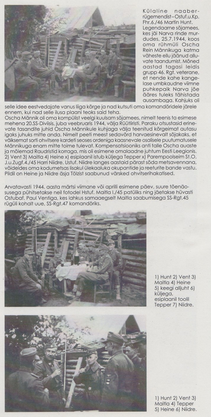 Maitla, K., Ollemaa, A., Tammiksaar, L., Paul Maitla päevikud, lk 44-45 ...Shiim kirjutas:Richard Säägi "Minu sõjamälestused", lk 23 on foto samast üritusest (seal nimetatud kui nõupidamine Maitla punkris). Vasakpoolne on ltn Unt, Maitlast paremal aga ltn Heine, veebel "Habe", ltn Niidre, kpt Tepner (siinsel fotol Tepner puudub).Shiim kirjutas:Paremal võiks olla Harri Niidre?otofoto kirjutas:Aga kes suudab sellelt pildilt tuvastada isikuid peale Paulide. Kes võiks see vunts olla ja tuttav nägu paremal?