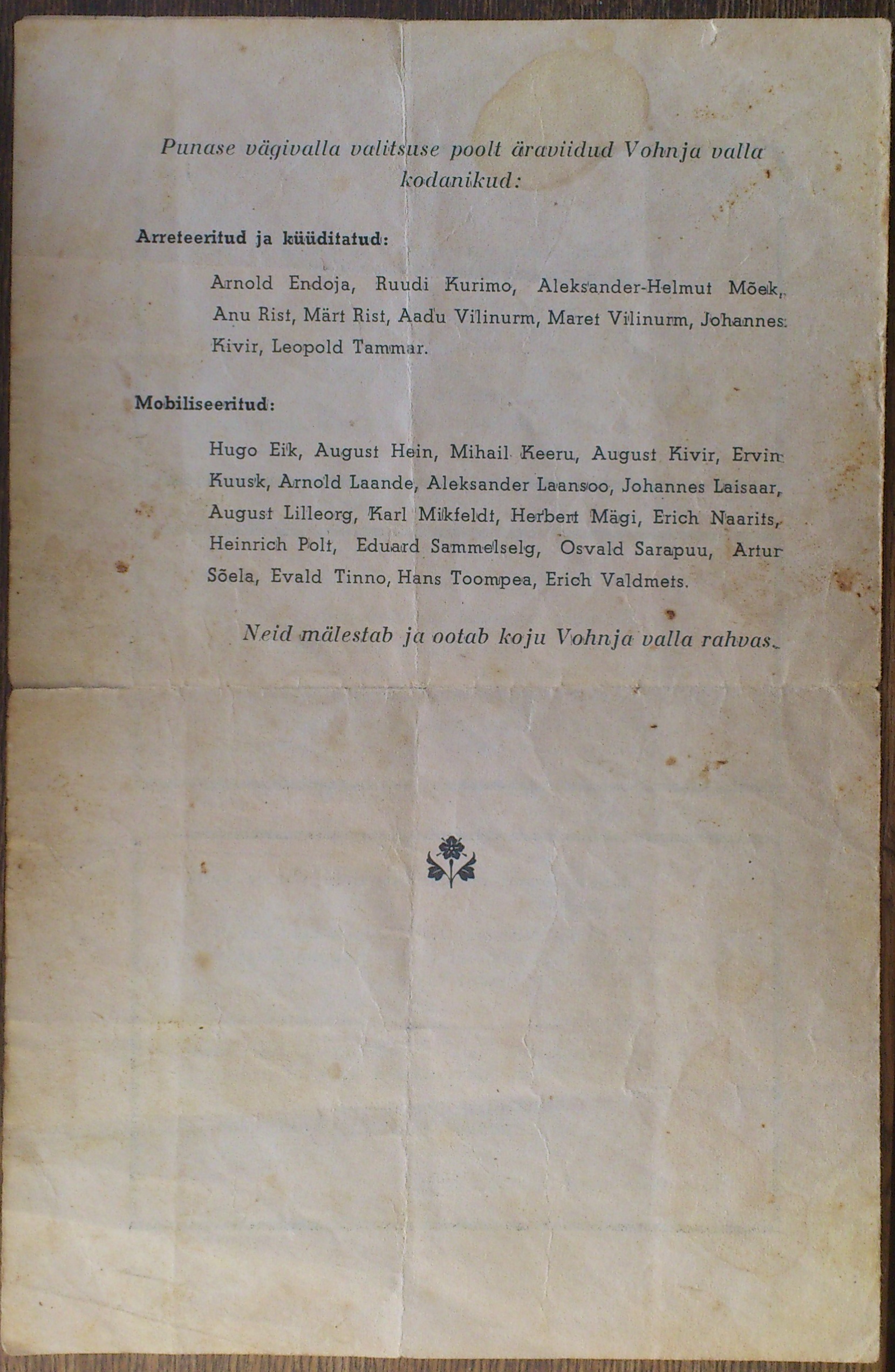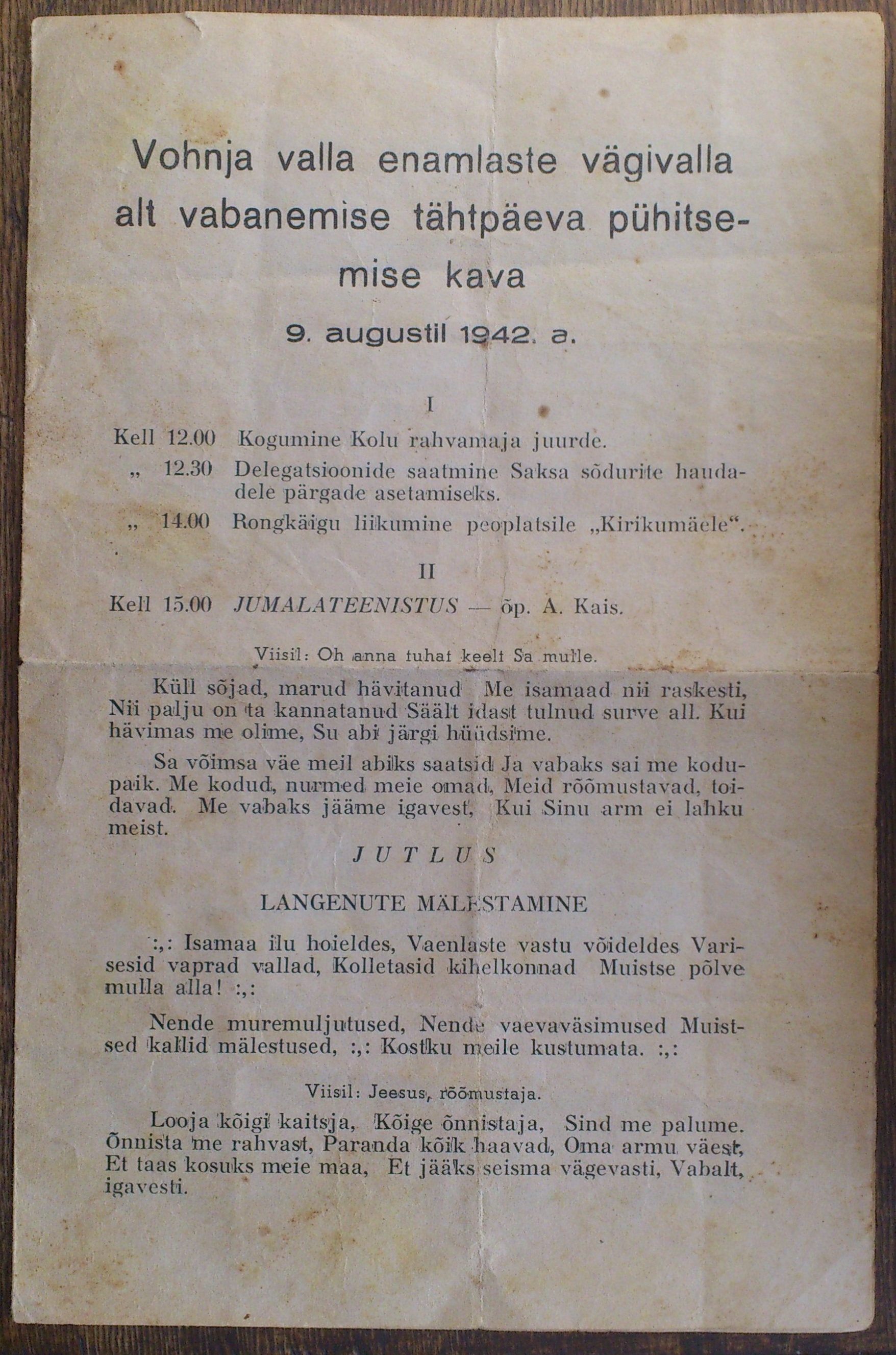 Võibolla pakub kellegile huvi Vohnja valla enamlaste vägivalla alt vabanemise tähtpäeva pühitsemise kava (9. august 1942.a.) Langenud, küüditatud, mobiliseeritud jne.